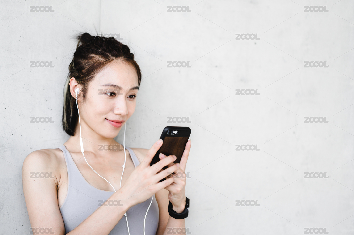 年轻的亚裔女子坐在楼梯上跑后放松身心。她用她的智能手机打字的消息。