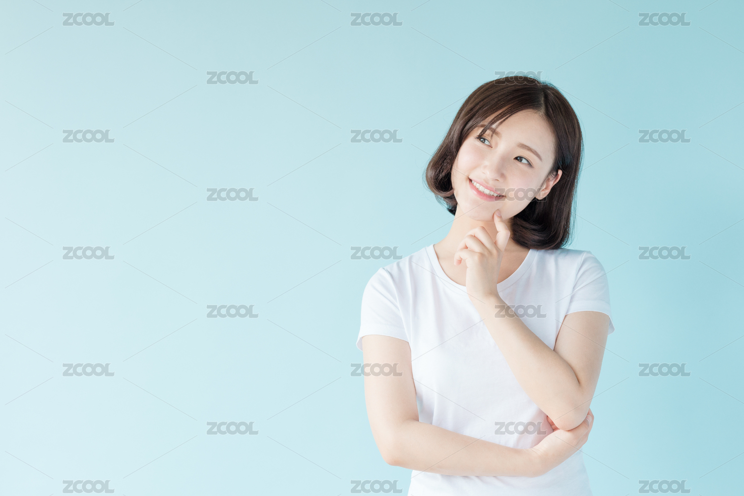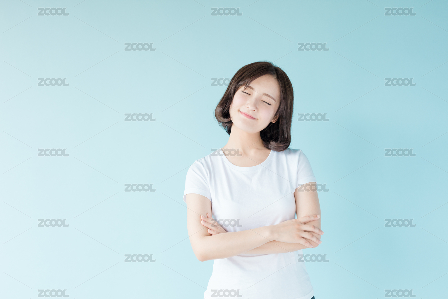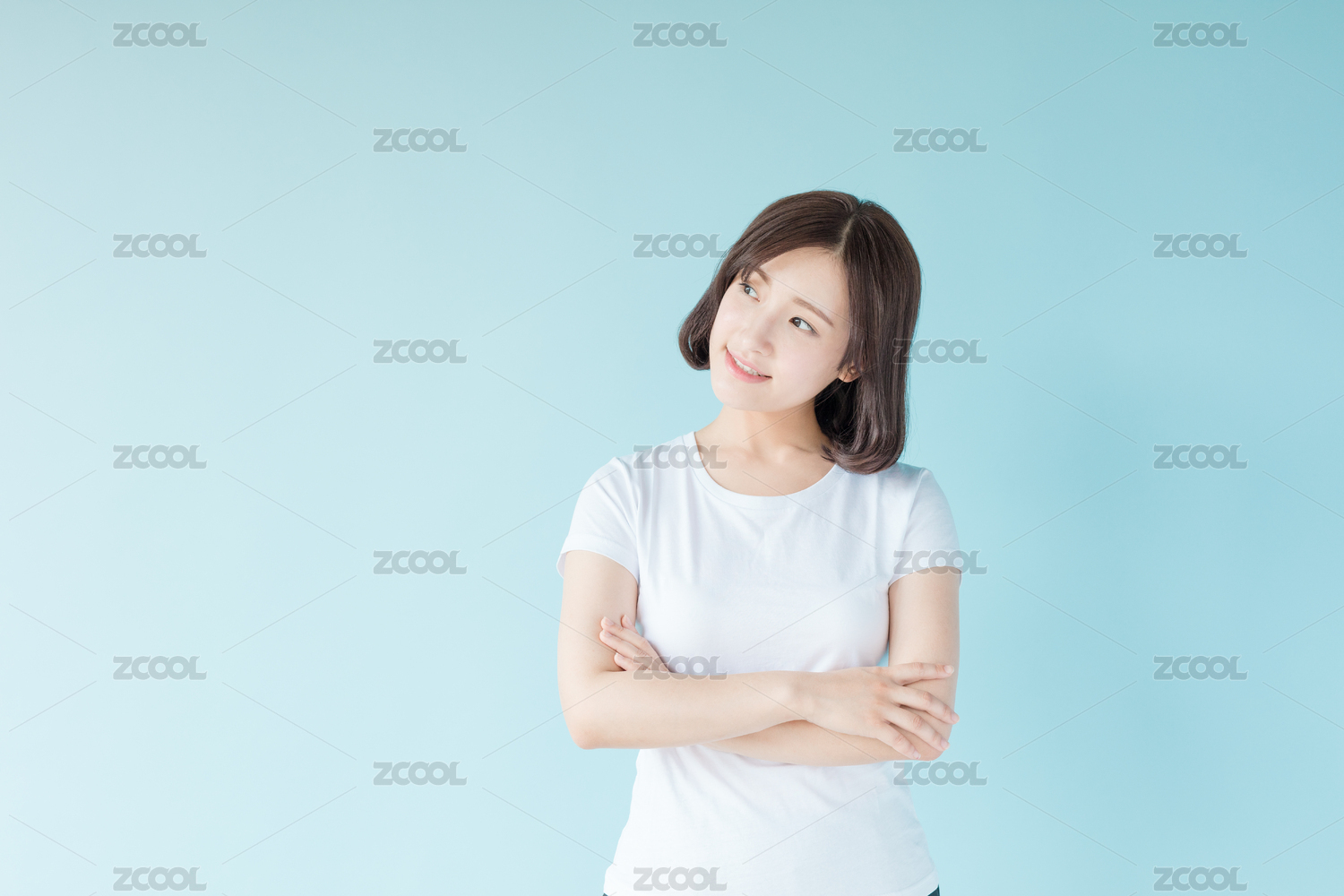 站在蓝色背景前的年轻女生