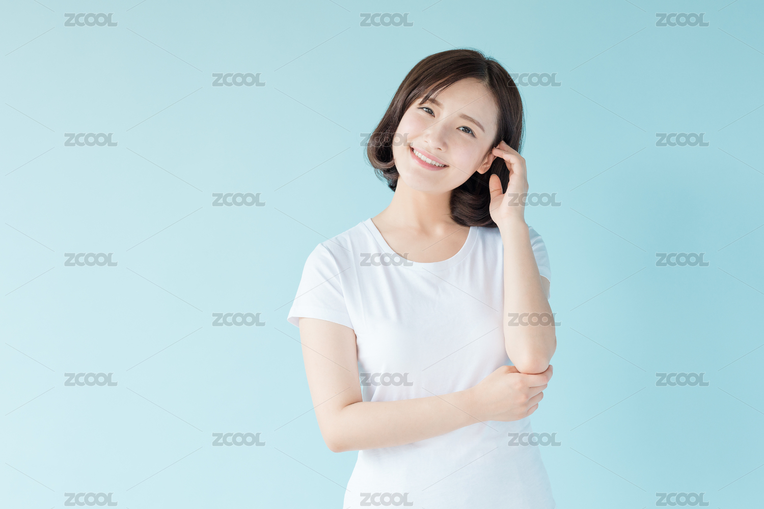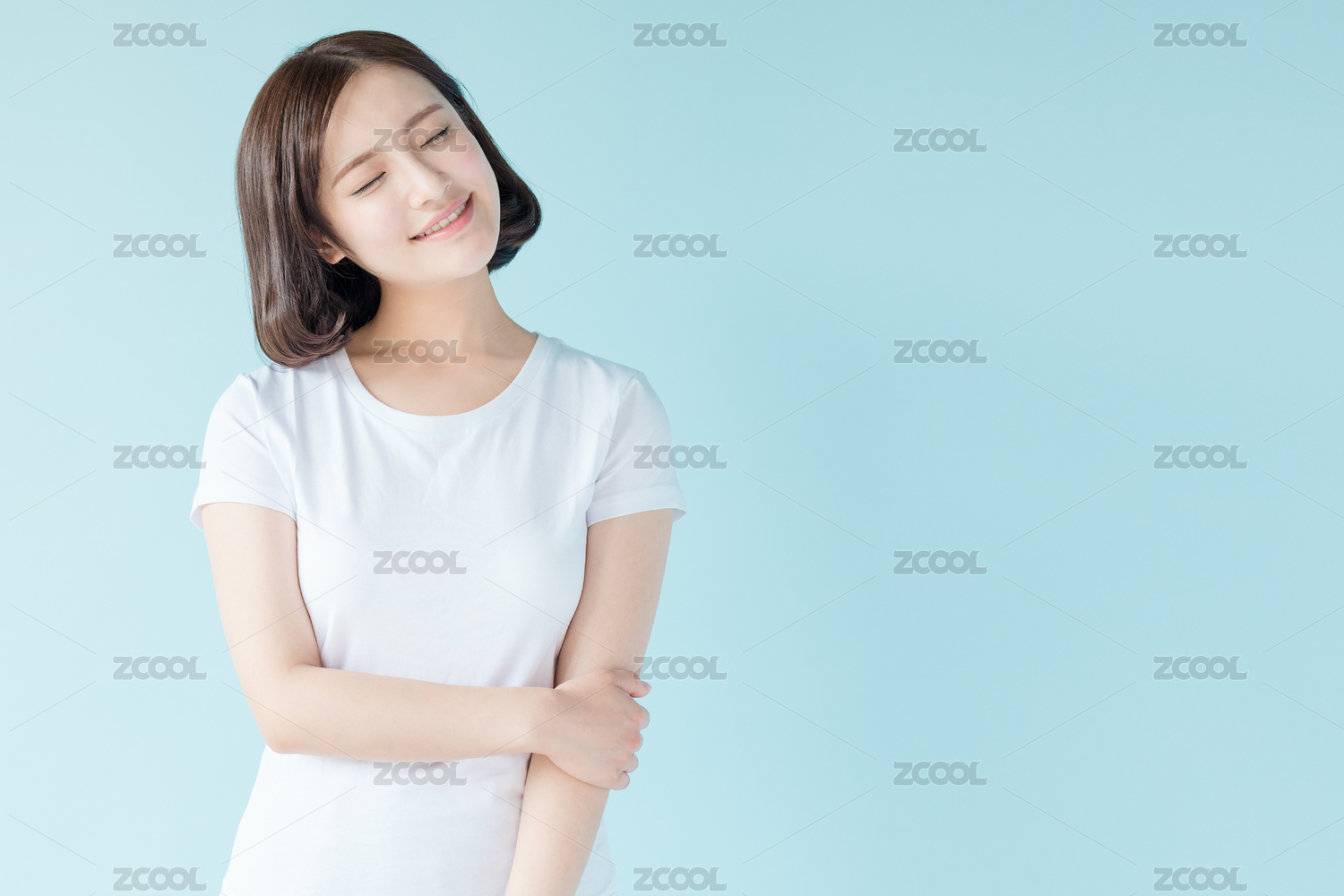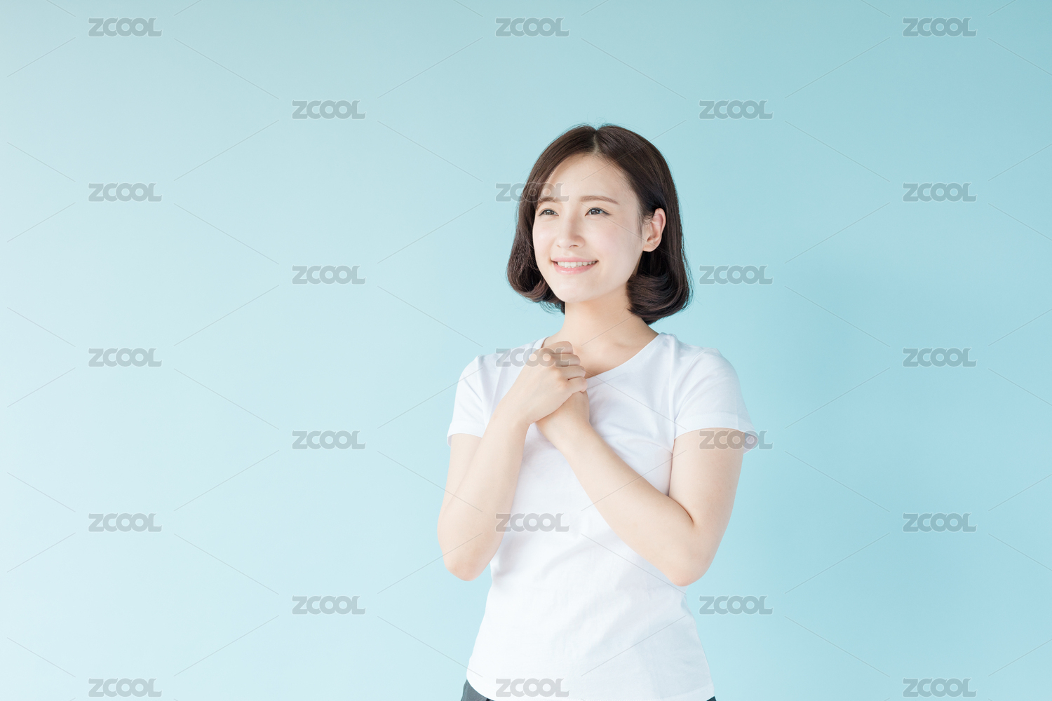站在蓝色背景前的年轻女生