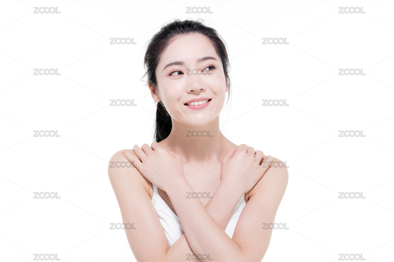 一位美丽的亚裔女孩双手交叉放在胸前侧脸微笑