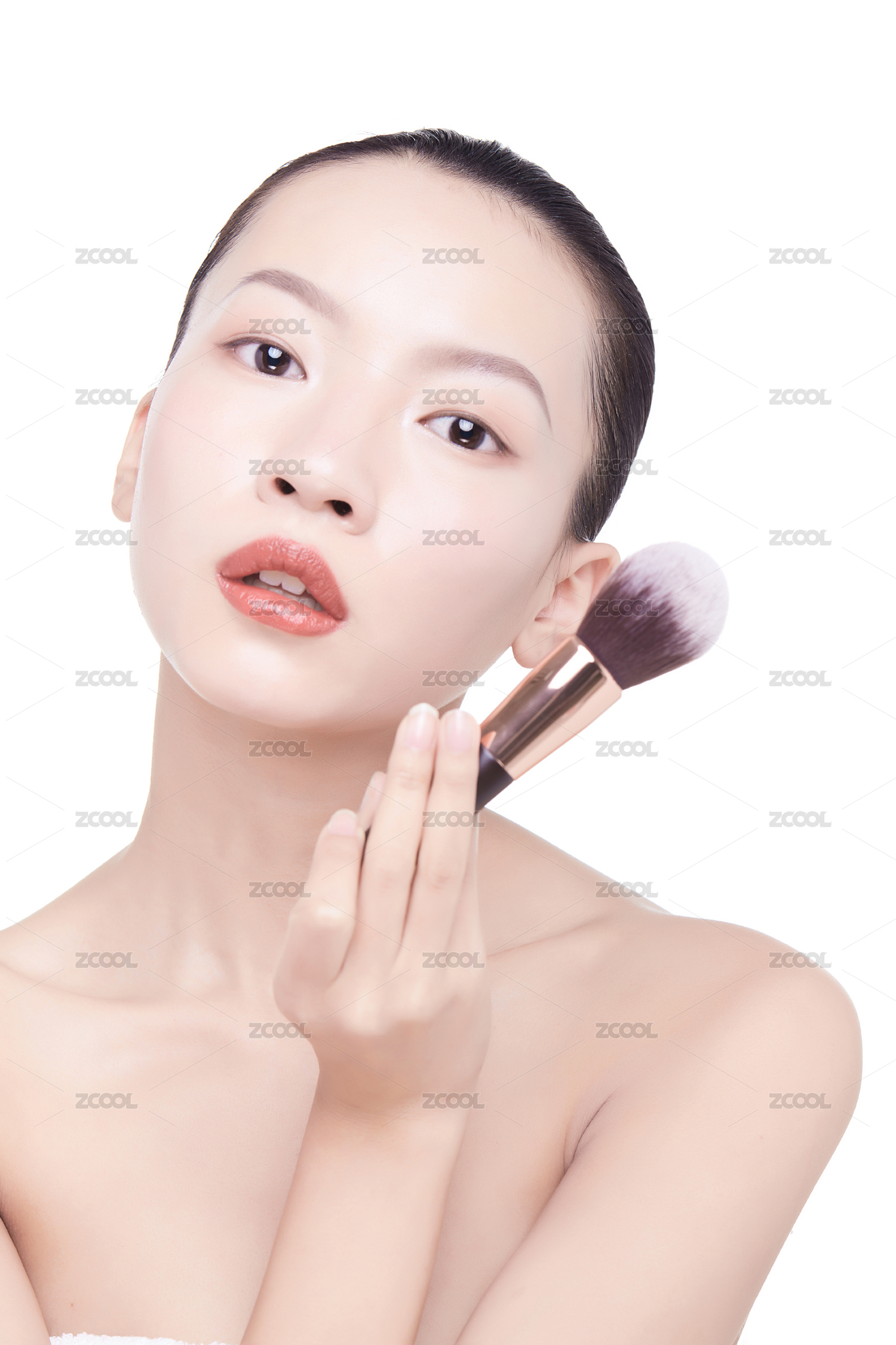 女子申请眼影用化妆刷,亚洲美容概念。在白色背景孤立