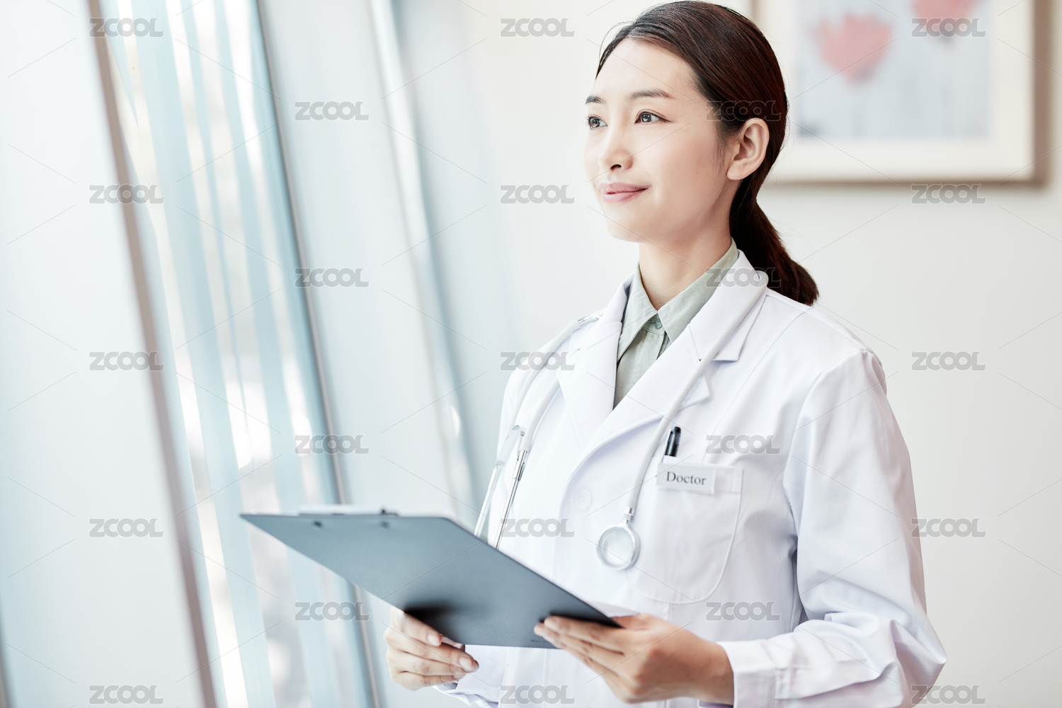 微笑的年轻护士拿着工作文件与医生交谈和讨论,当他们在医院的办公室窗前站立的医疗计划。