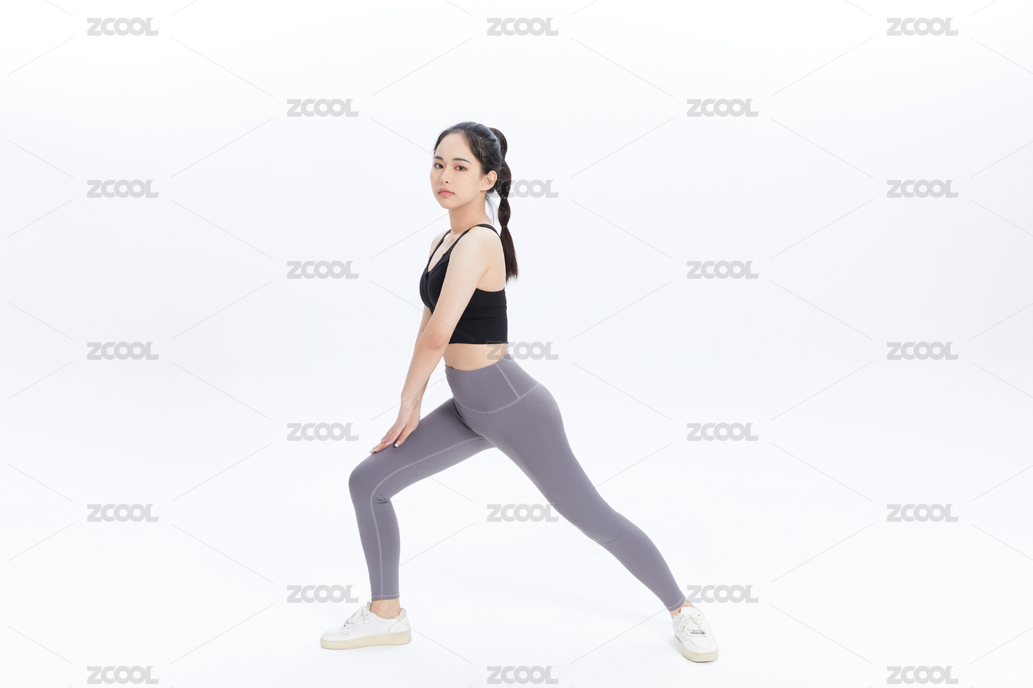 一个中国人美女正在运动锻炼身体白色背景白底棚拍跨栏跳跃跑步飞奔极速跨过姿势动作运动鞋