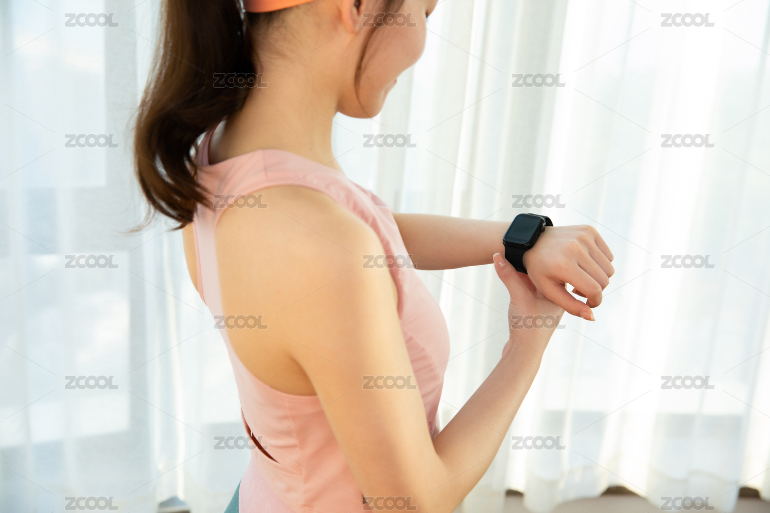 女手在房间里触摸屏通用设计智能手表的照片。混血亚洲的中国模式。