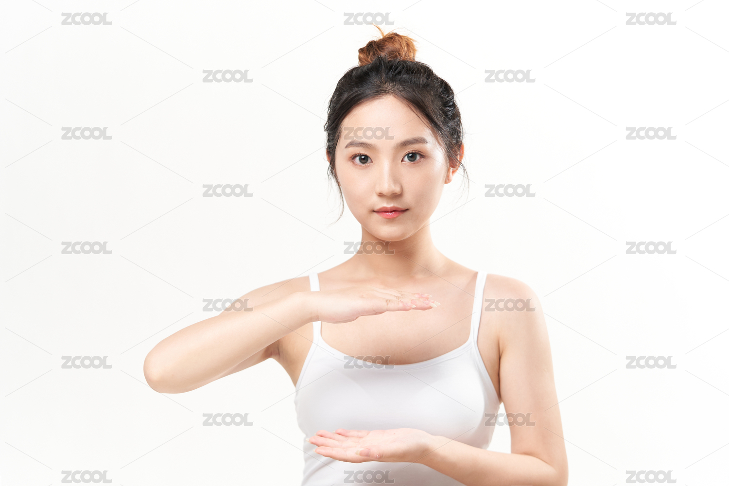 白色背景前托着产品的东方美女