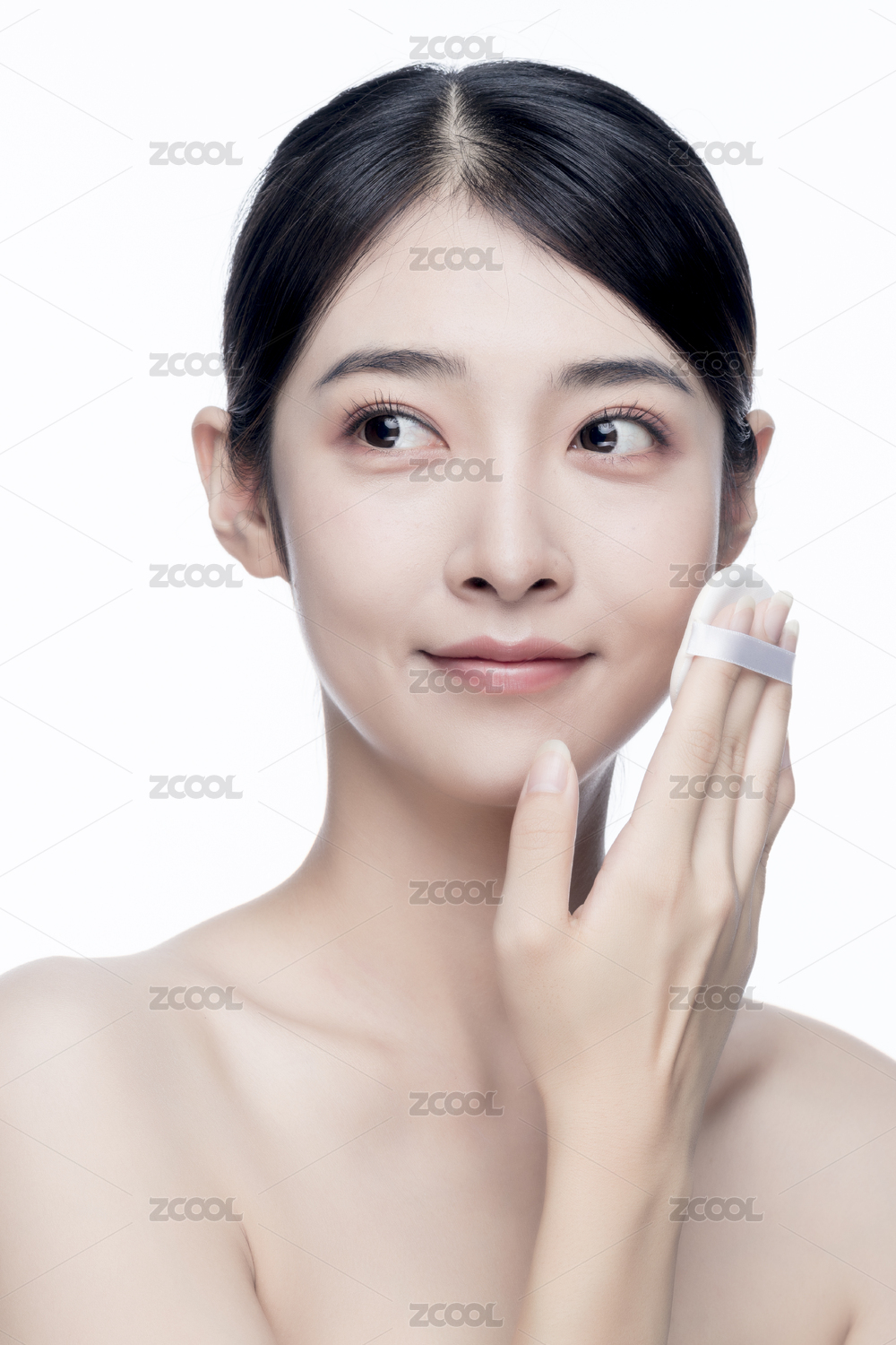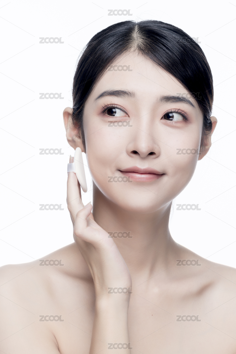 年轻的亚洲美女使用粉扑的白色背景半身肖像