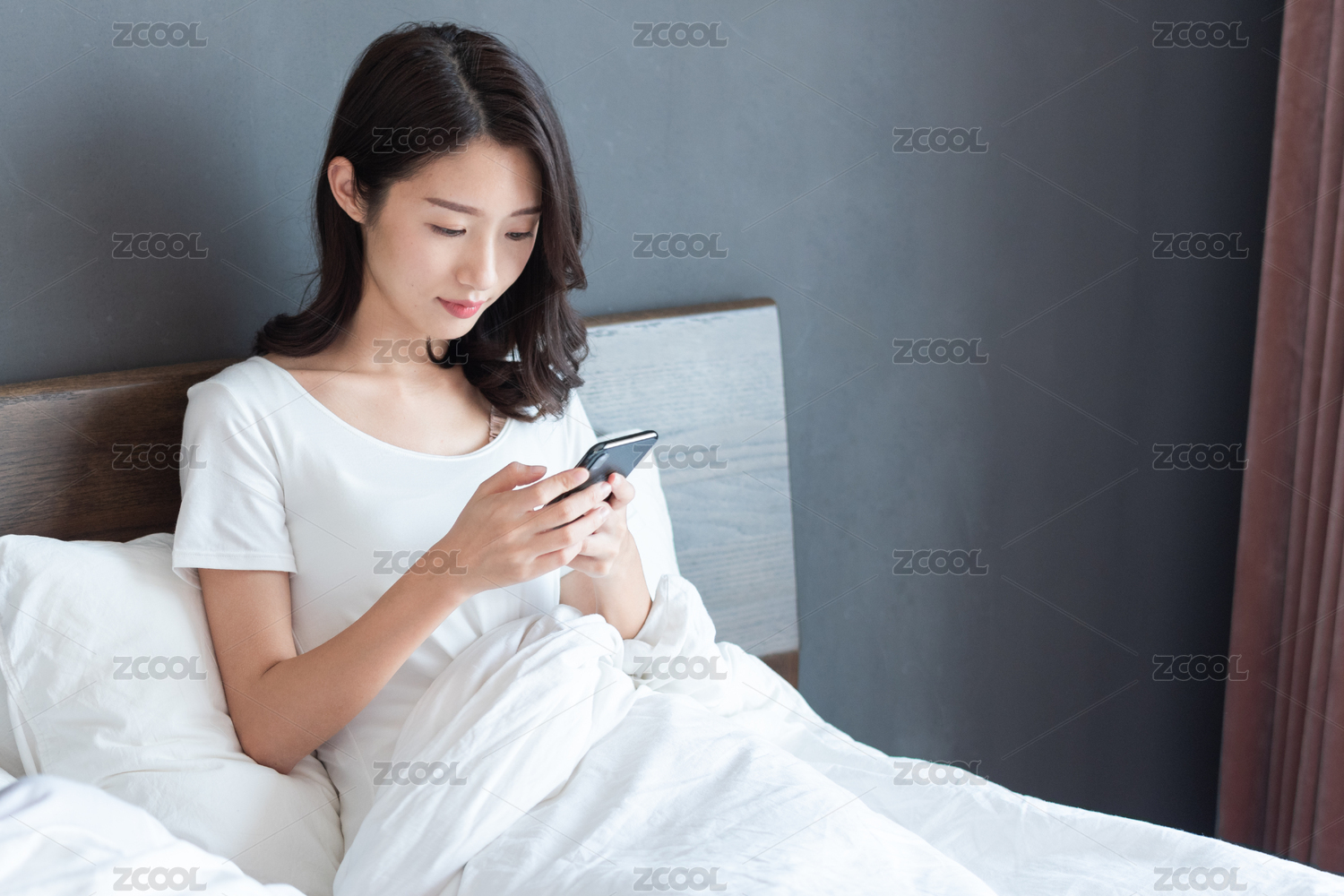 一名年轻的亚洲女子半躺在床上双手拿着手机