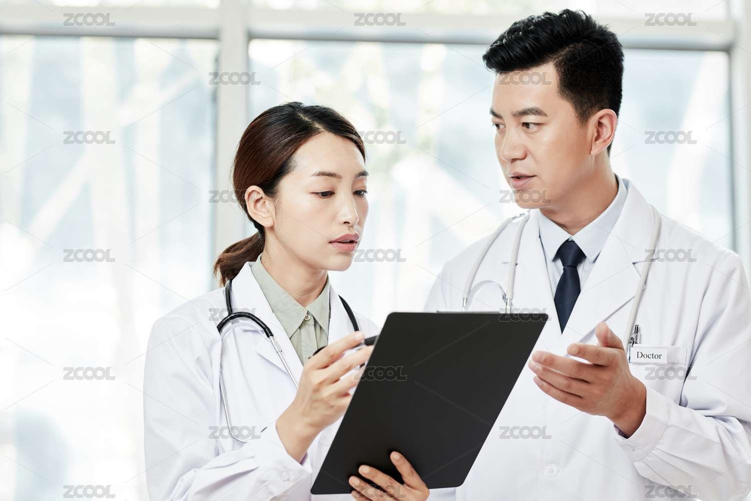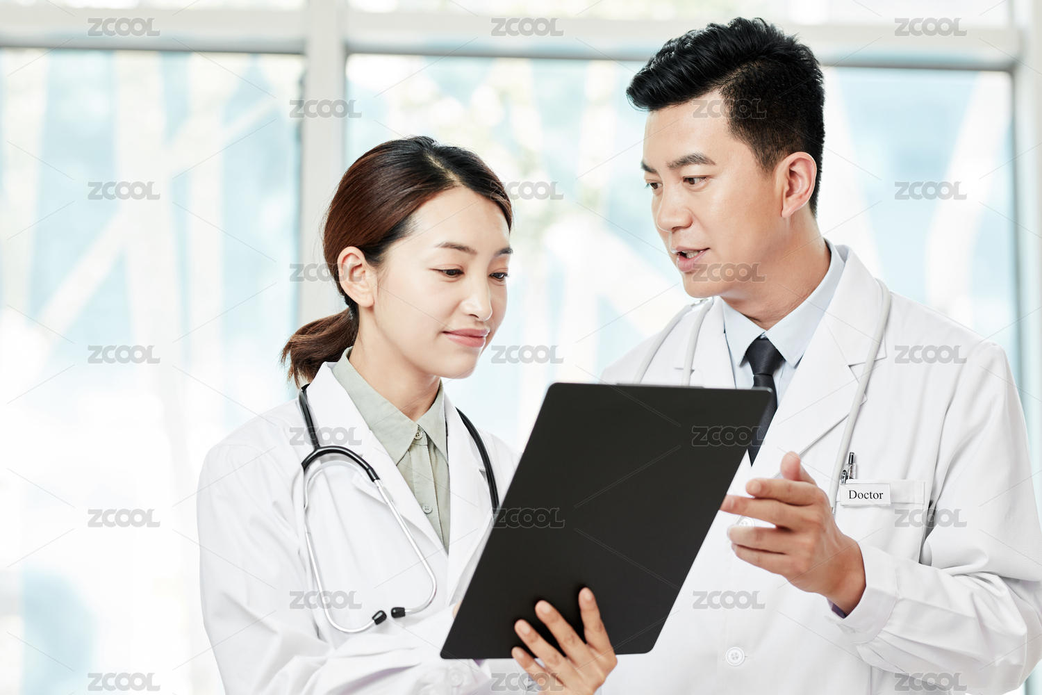 微笑的年轻护士拿着工作文件与医生交谈和讨论,当他们在医院的办公室窗前站立的医疗计划。