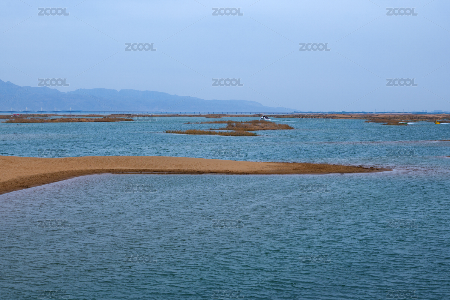 浙江省海宁市盐官度假区-晴空下的河滩风景