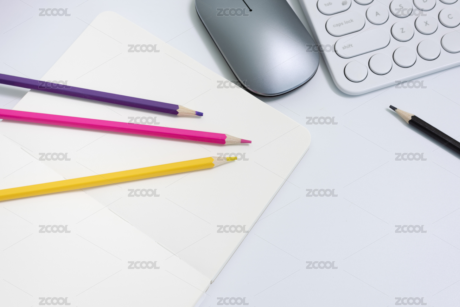 白背景上的鼠标键盘笔记本和铅笔