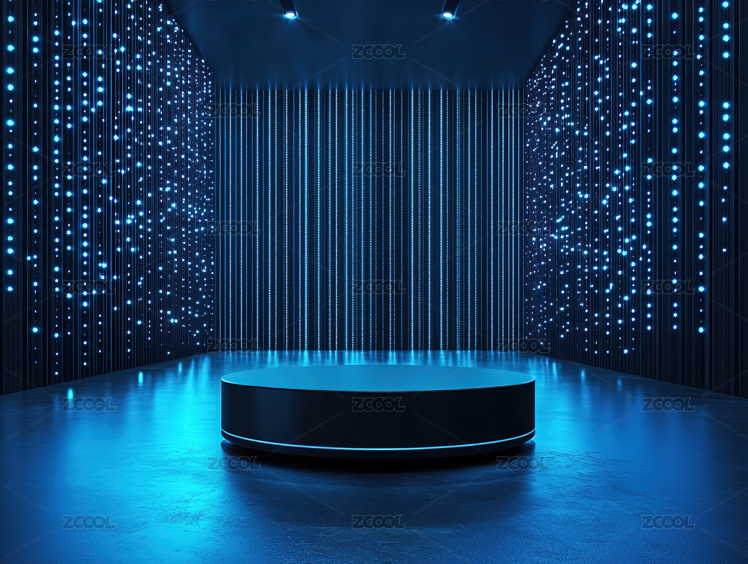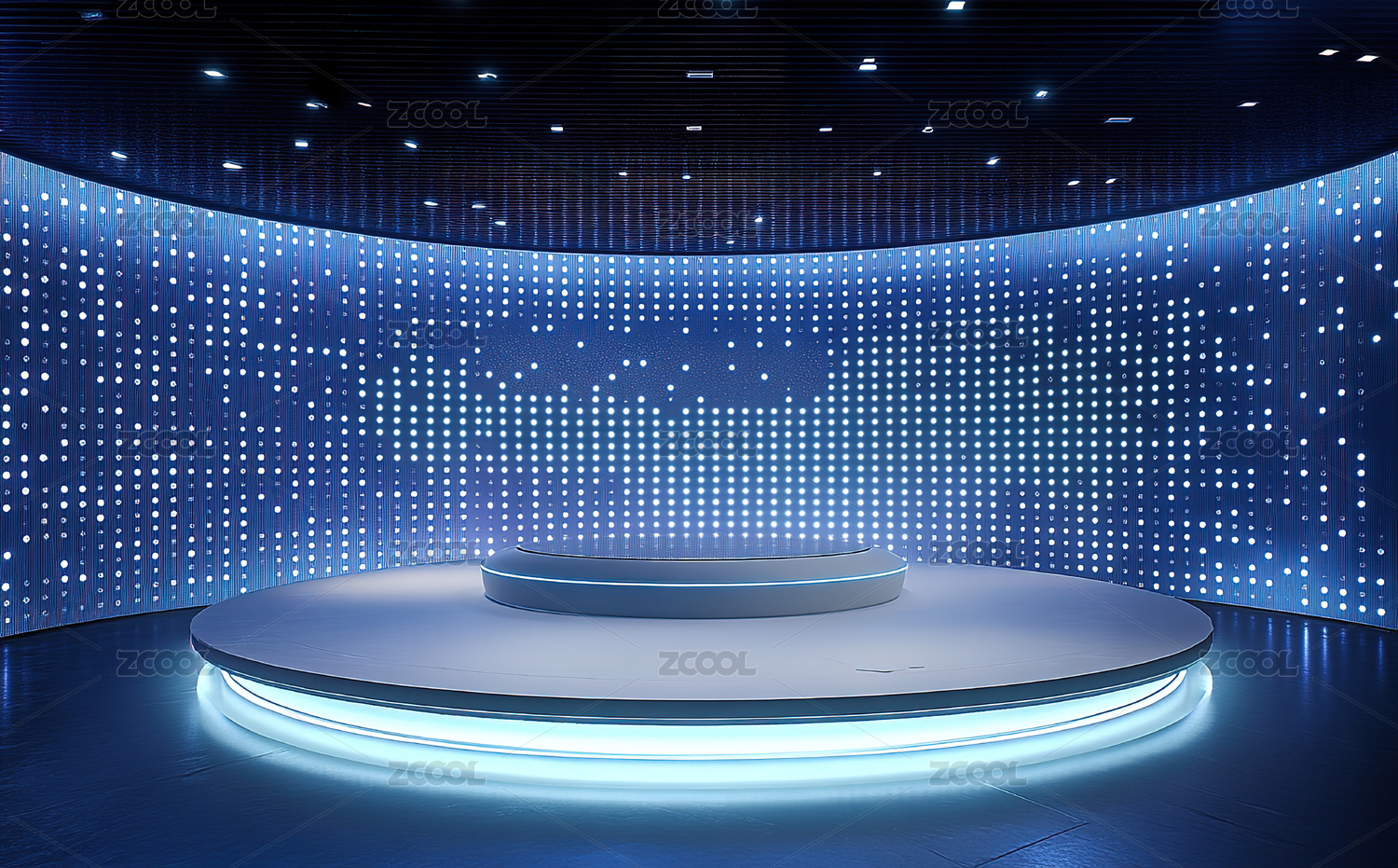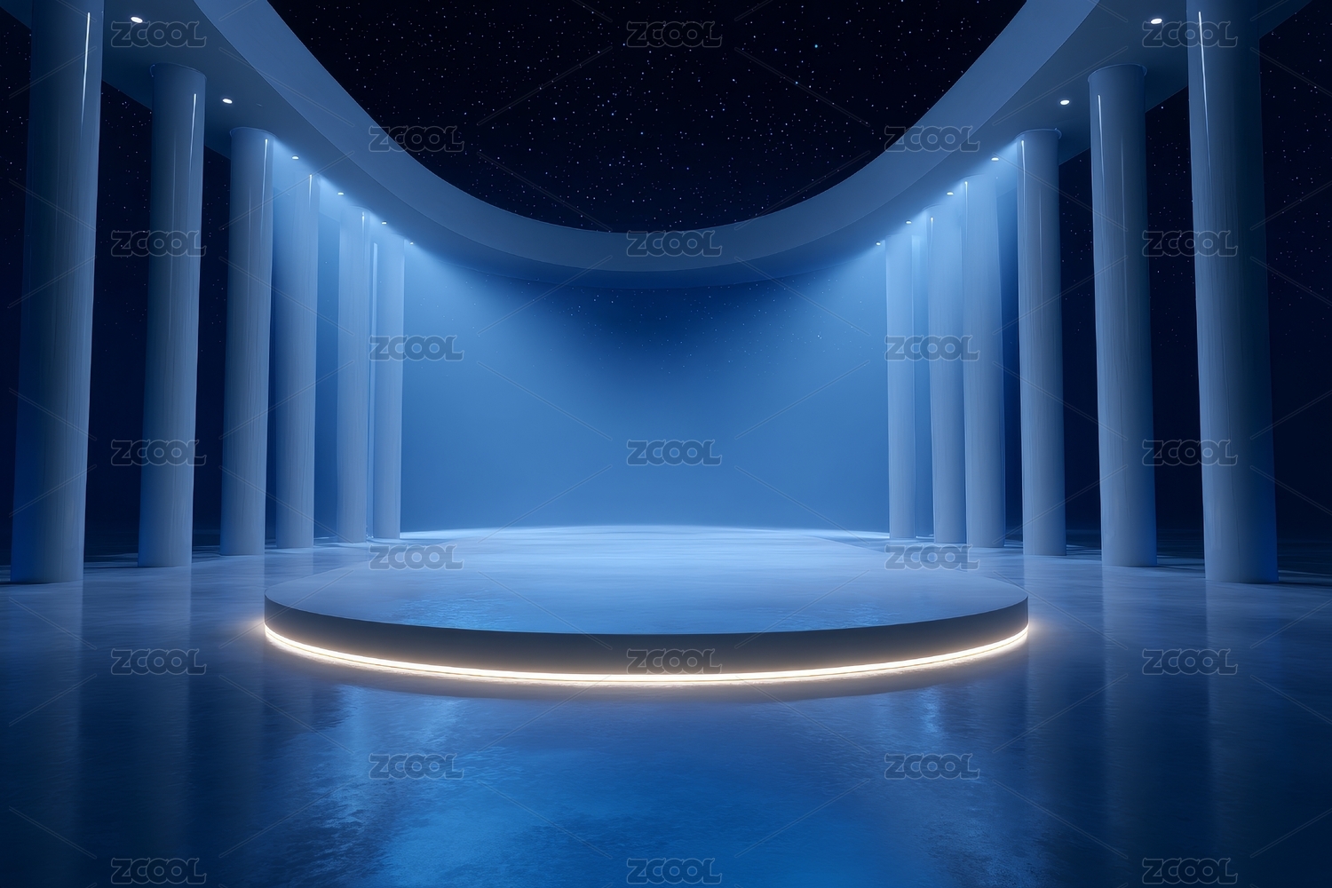 蓝色霓虹灯照射下的圆形阶梯舞台