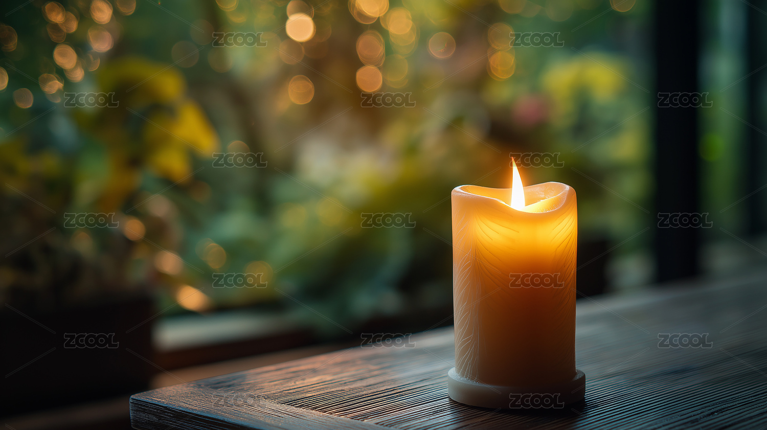 浅色台面上点亮的黄色电子蜡烛配窗景