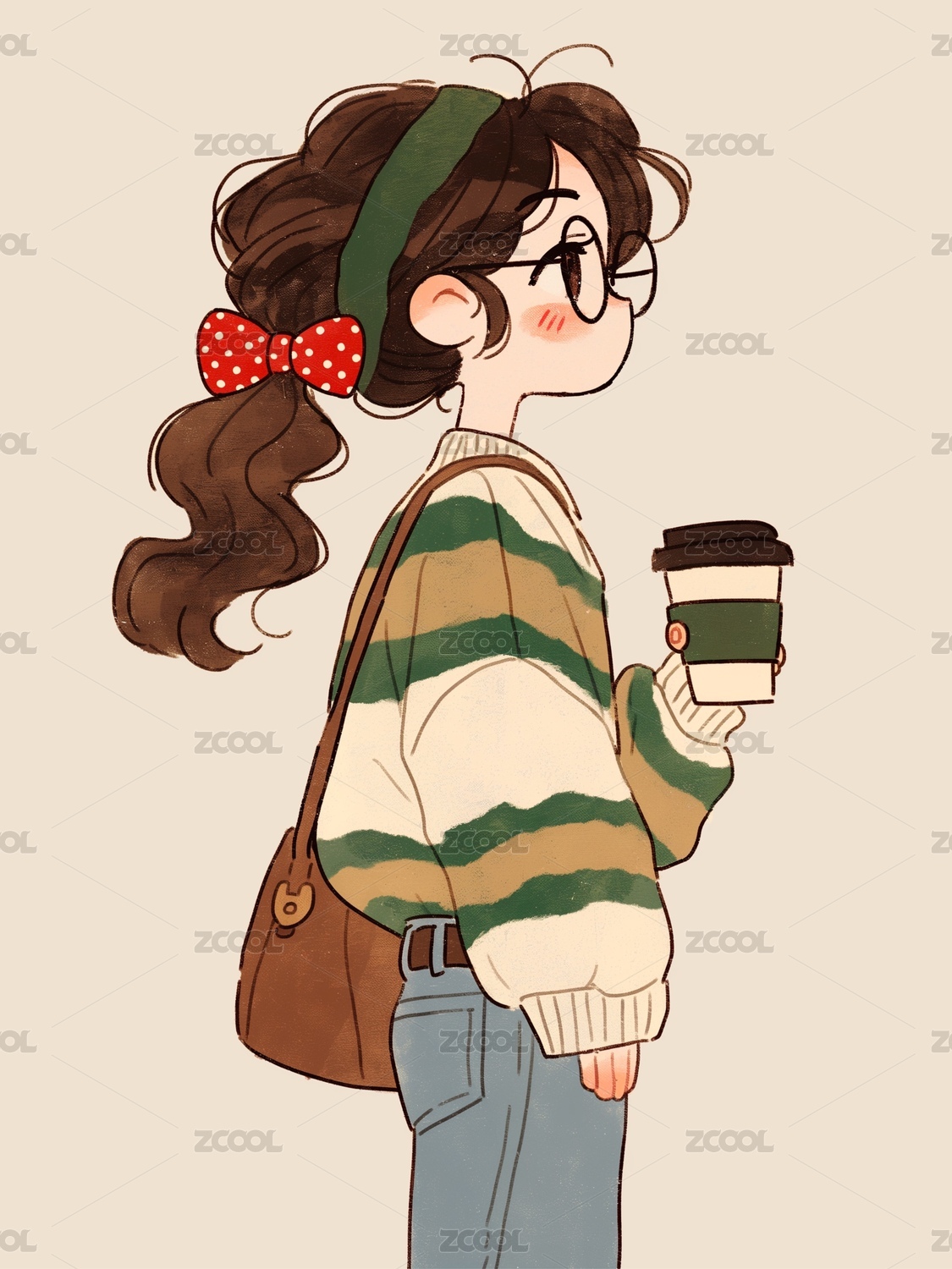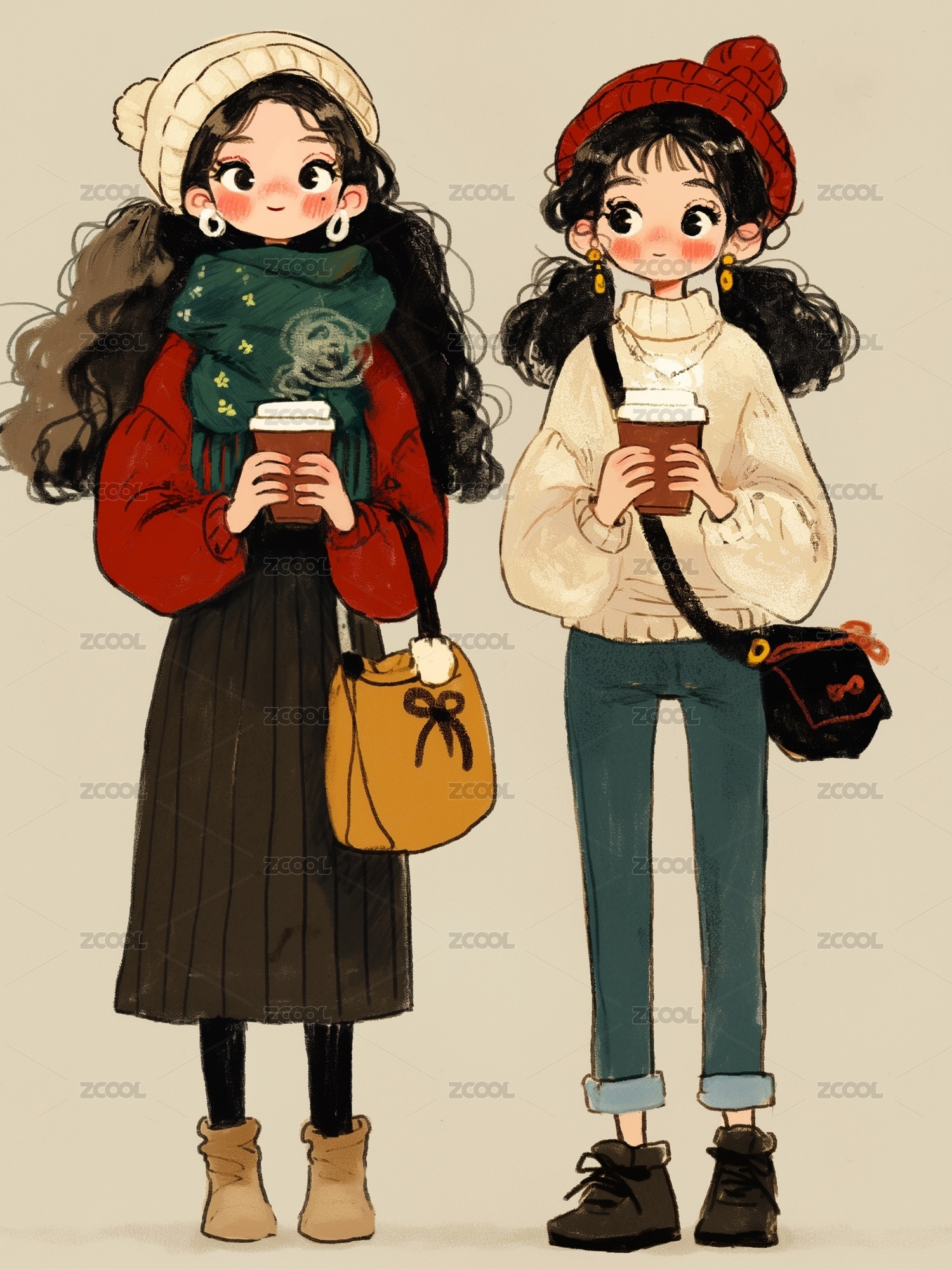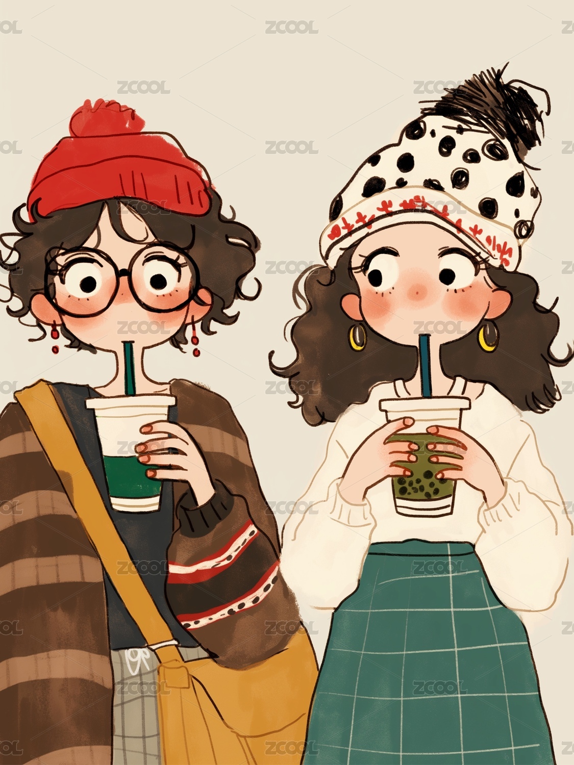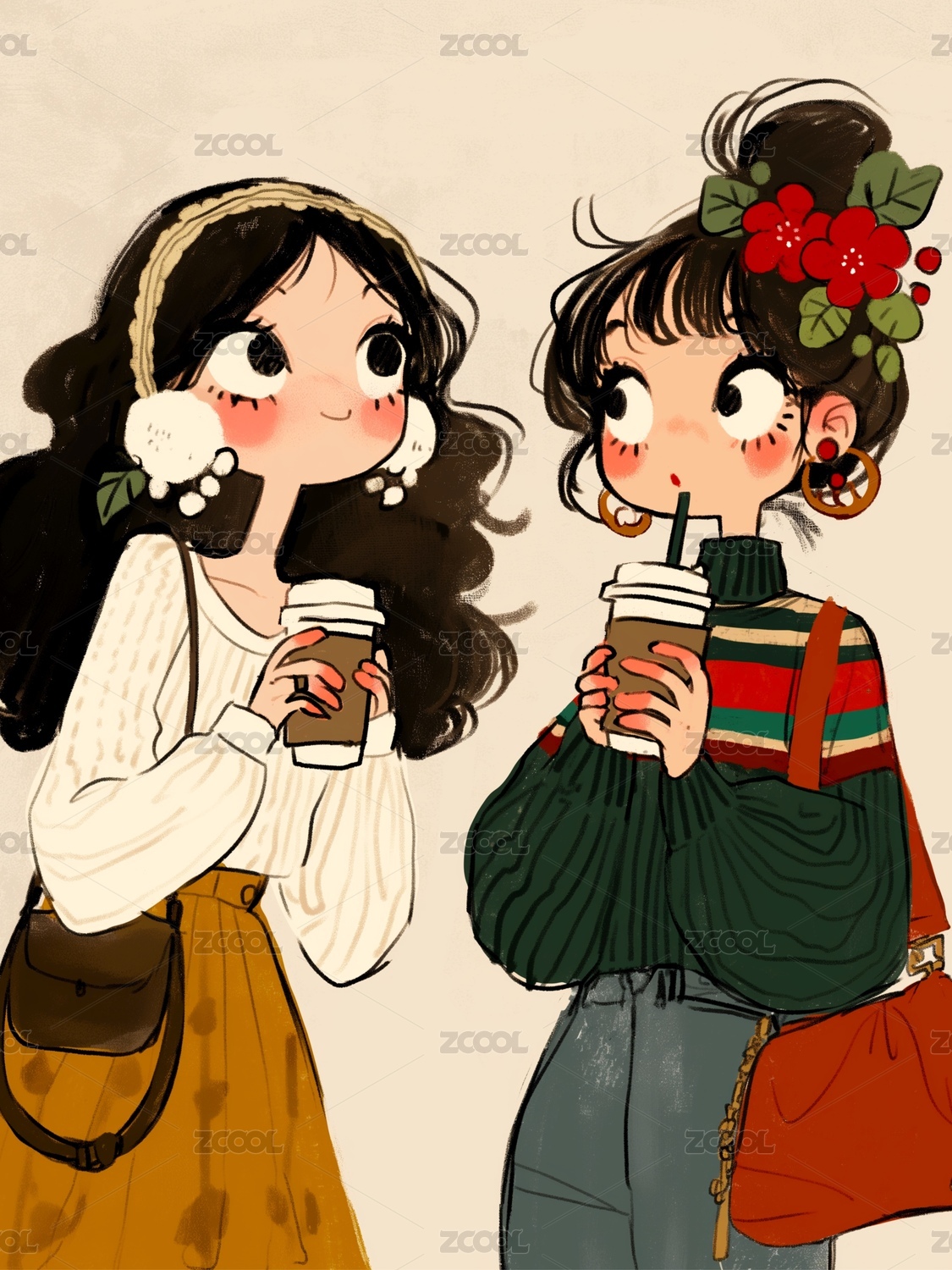 咖啡,闺蜜,插画,可爱,治愈,包,笑容