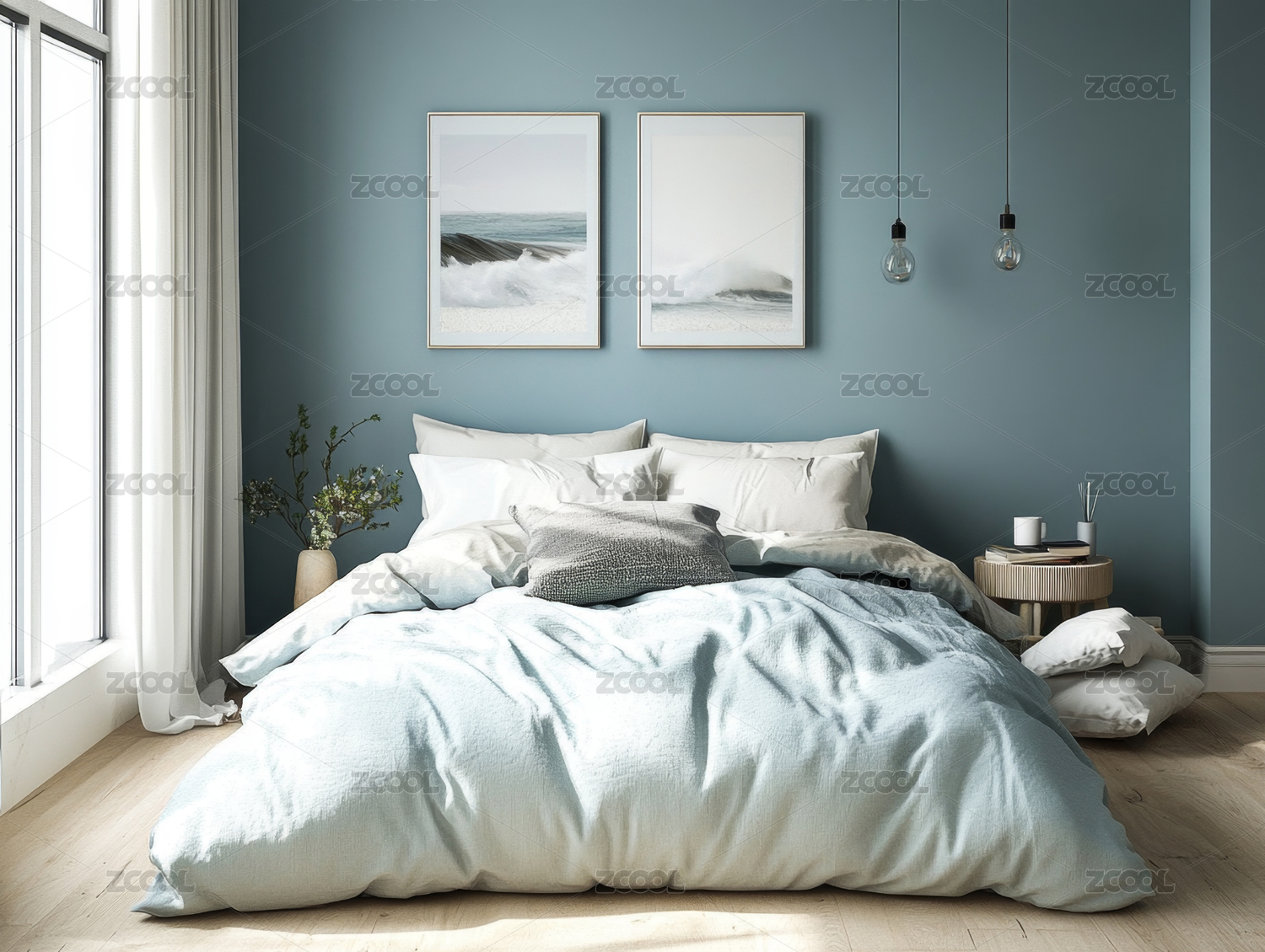 现代简约卧室灰白配绿植艺术画点缀温馨舒适