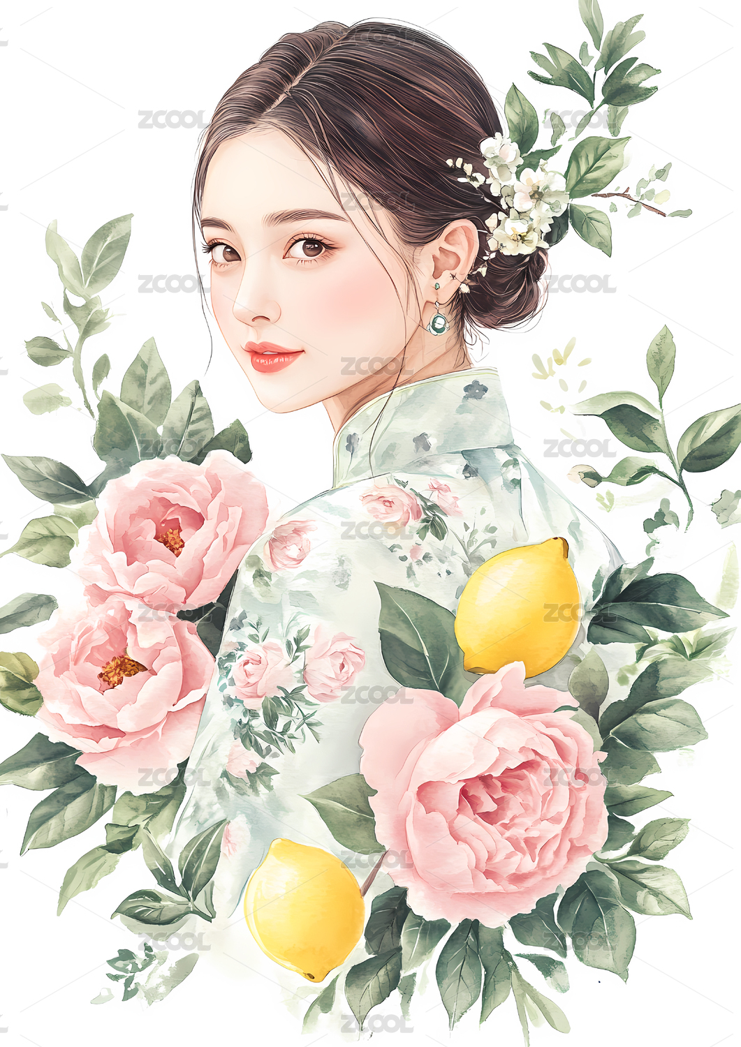 少女,旗袍,中国风,东方,微笑,卡通,人物,肖像,女性,可爱
