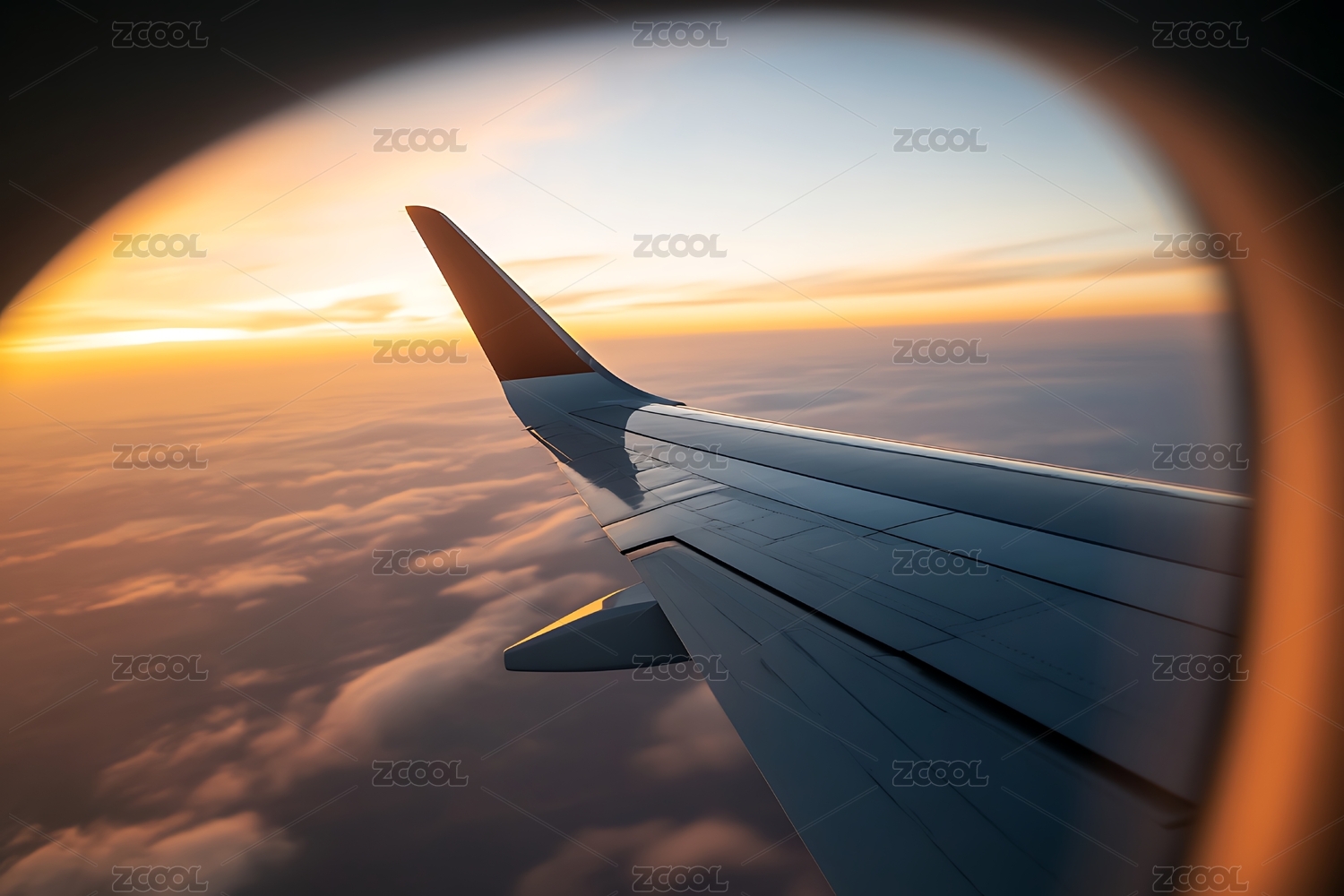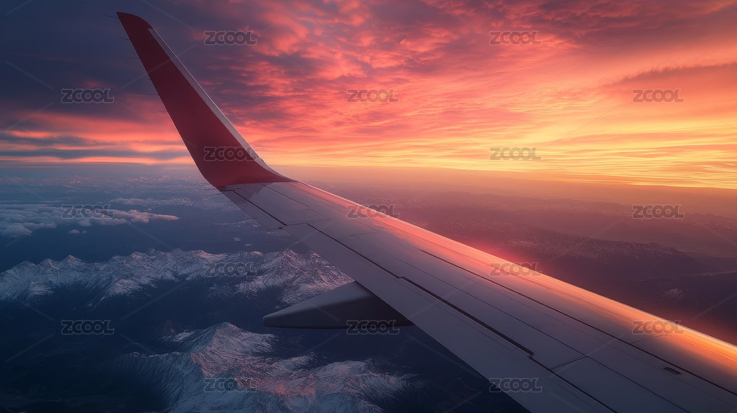 日落时飞机窗外景色带机翼