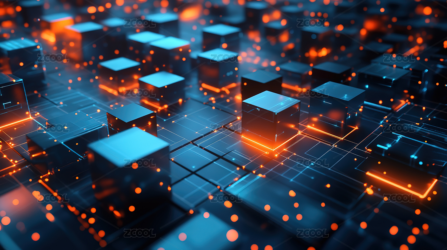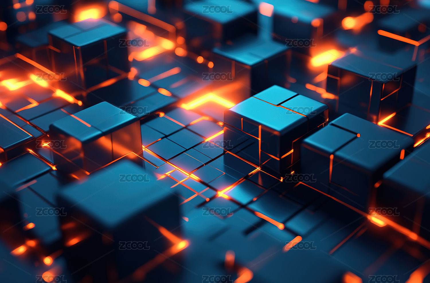 立方体,蓝色,橙色,网络,电路,光芒,数据,科技,未来,能量