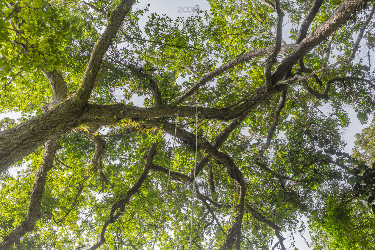 阳光下仰拍樟树弯曲枝条繁茂绿叶