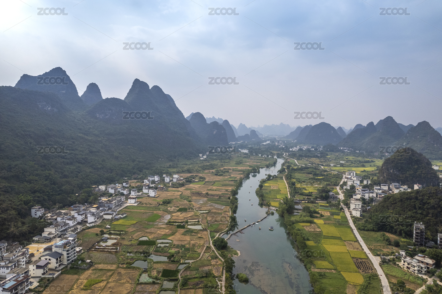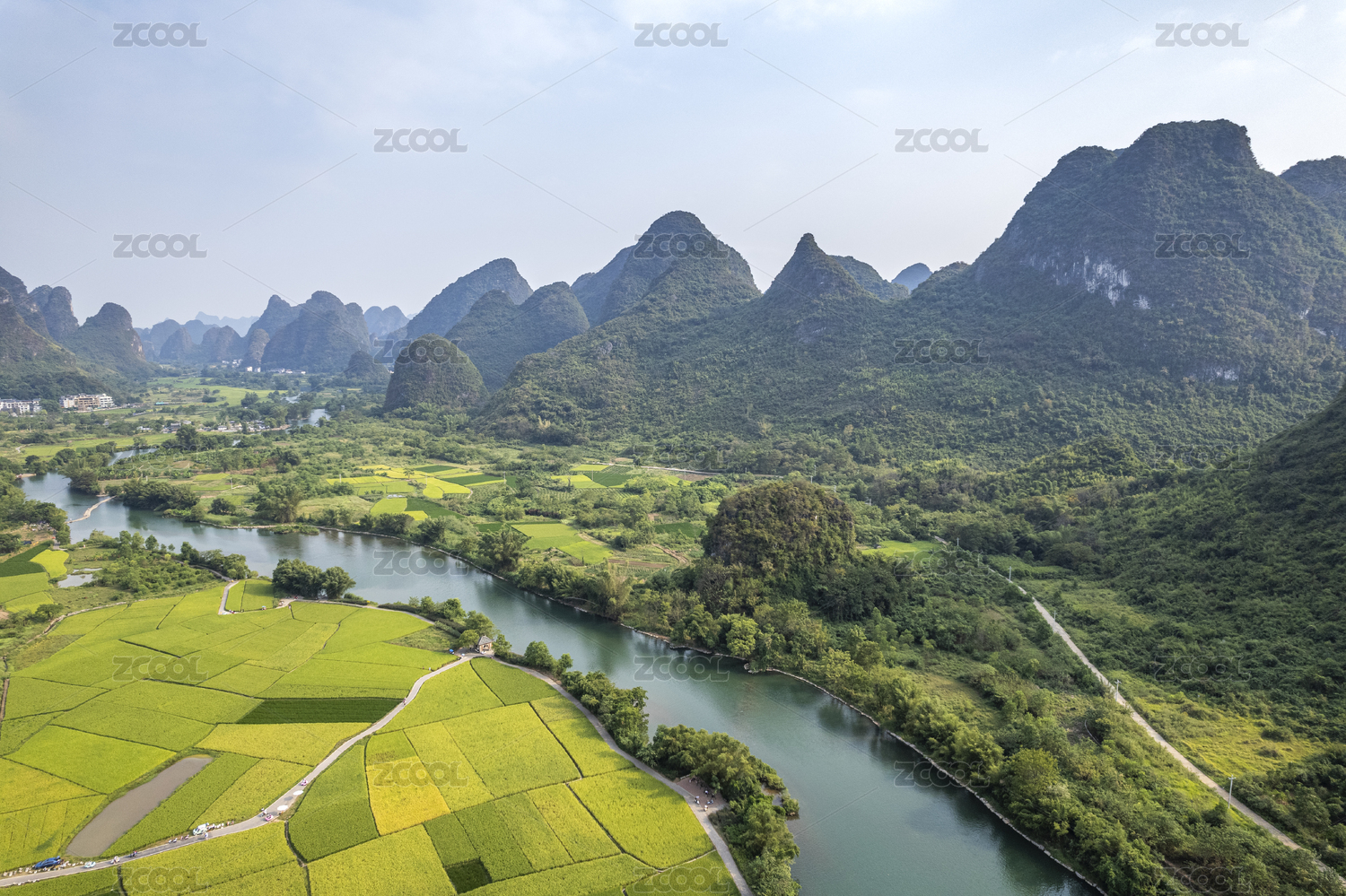 中国桂林阳朔遇龙河两岸稻田丰收山水风光