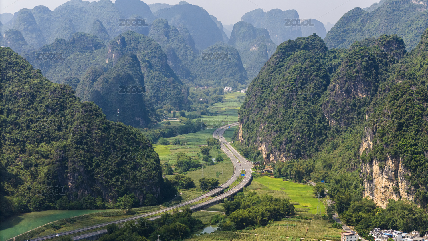 广西,崇左,和那高速,高速公路,峰林,田园,田地,航拍视角,河流,稻田