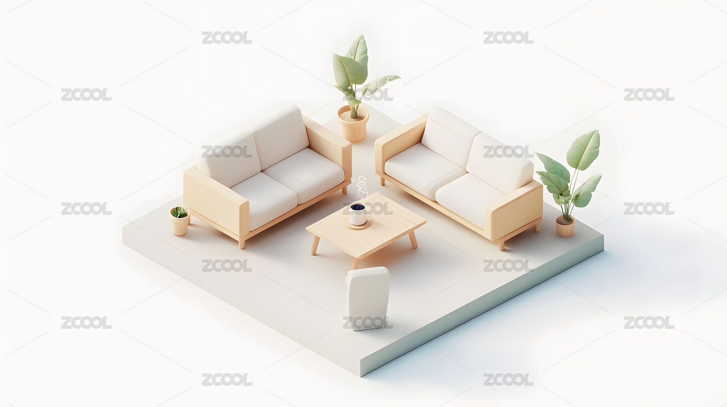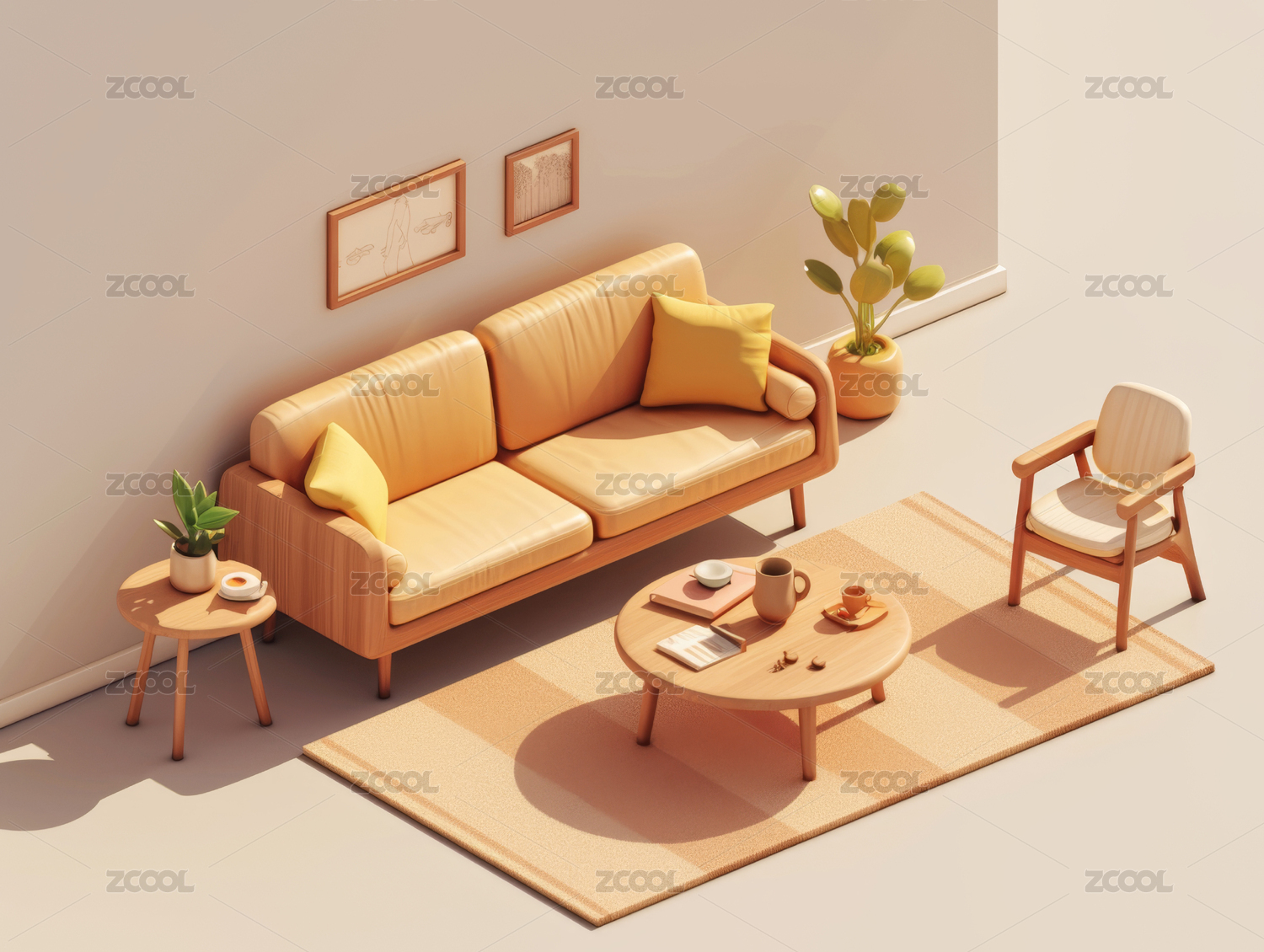 冷色客厅装修俯视立体轴测图3D卡通插画