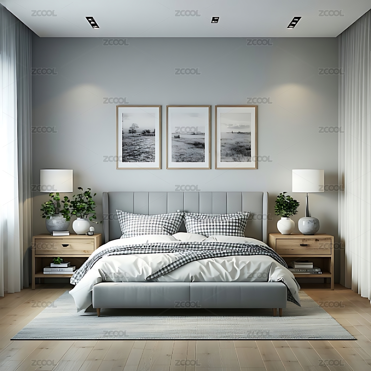 现代简约卧室木质地板和家具灰色床品白色窗帘黑白照片装饰