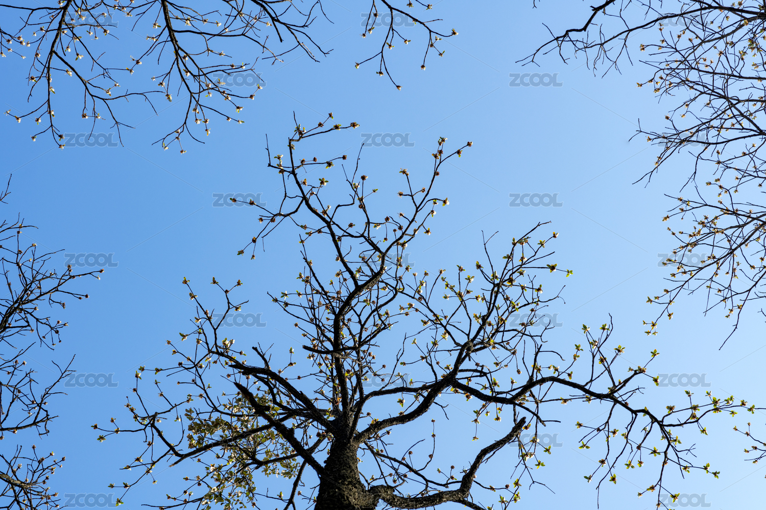蓝天晴空下的秃树枝树干