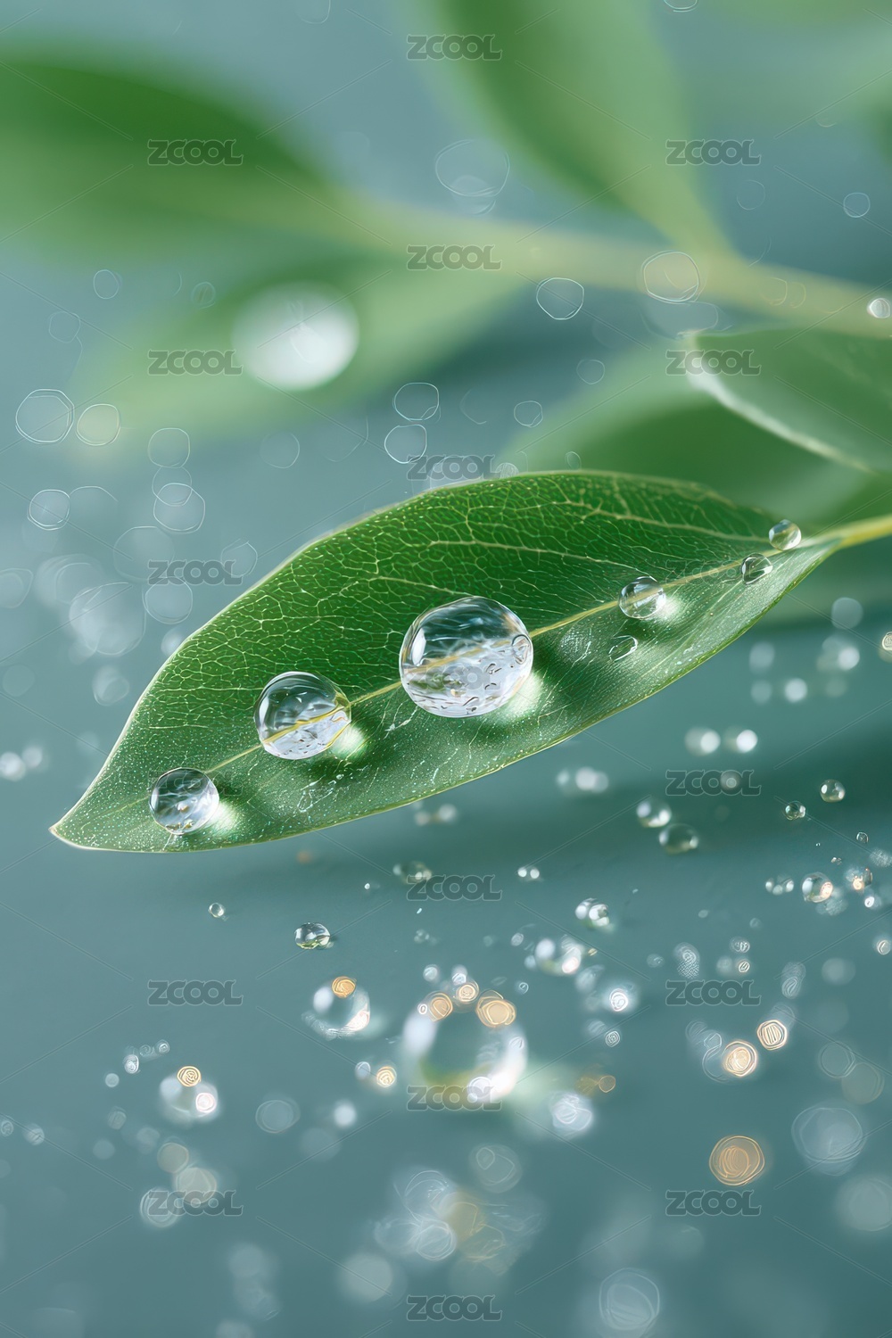 漂浮于水珠间的翠绿叶片