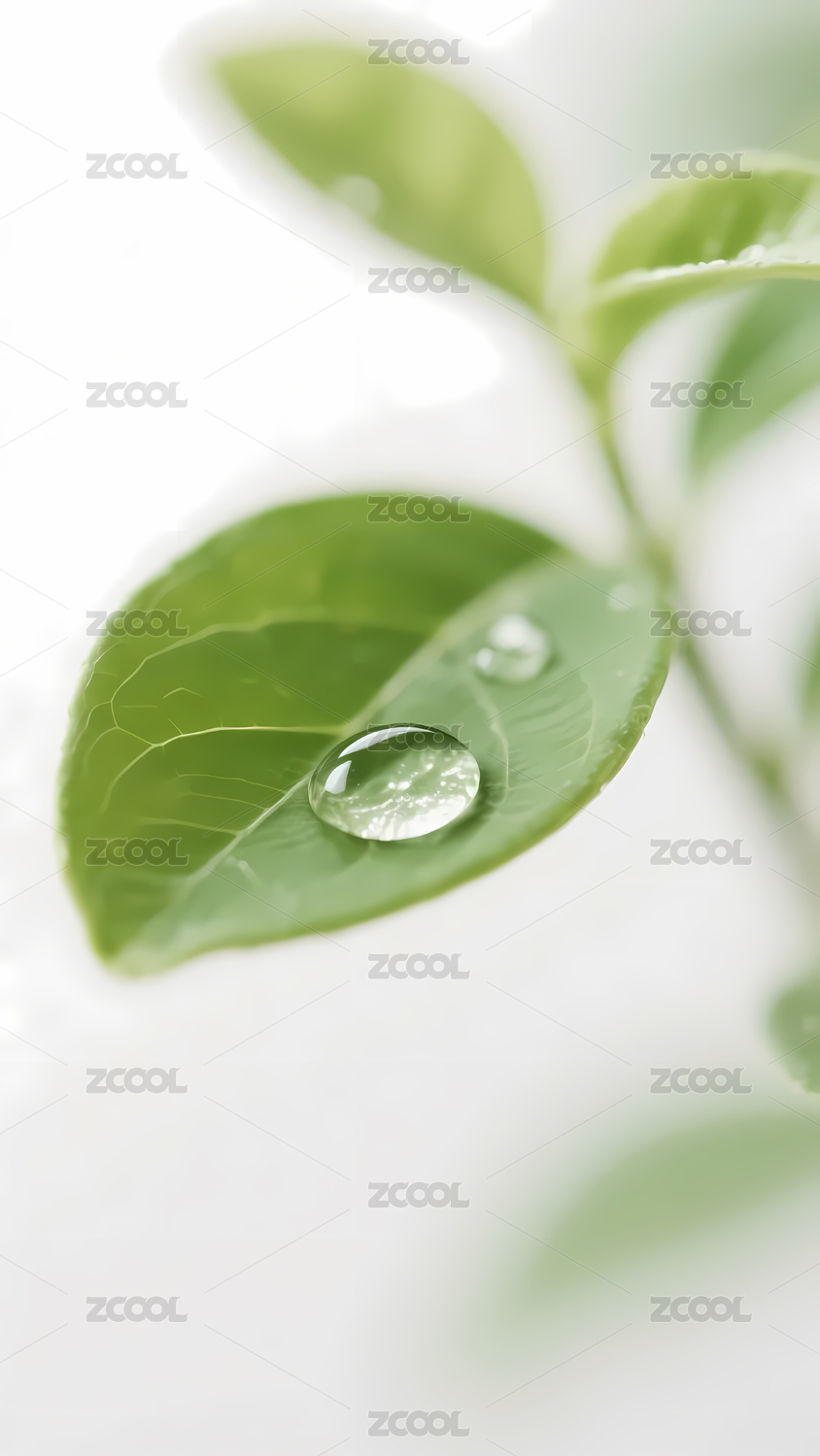 绿叶水滴于白色柔滑表面