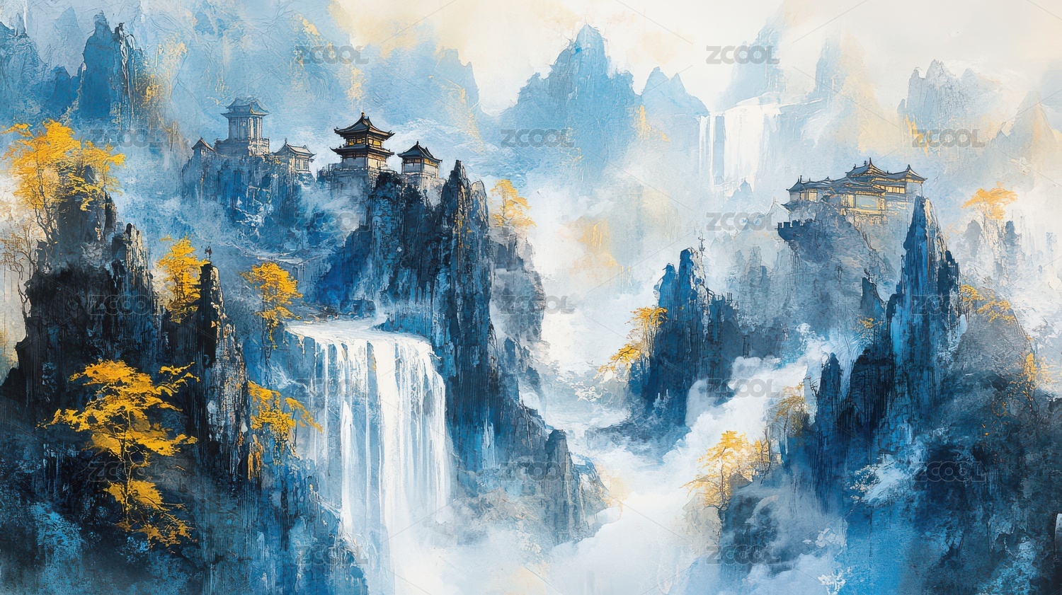 背景,光影,中国风,山水画,瀑布,山峰,金色,云雾,古建筑,自然