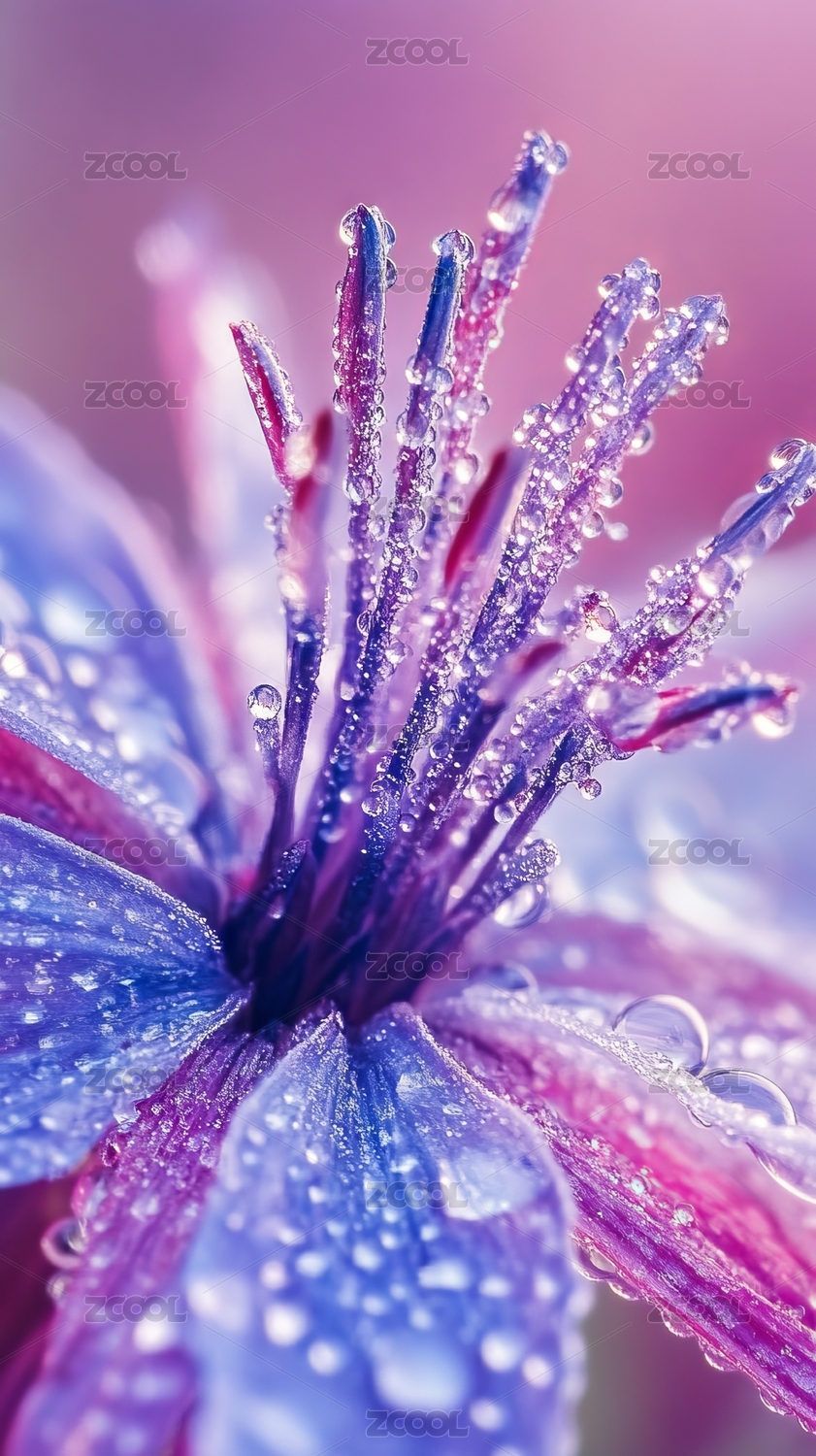 露珠点缀的紫色花朵特写