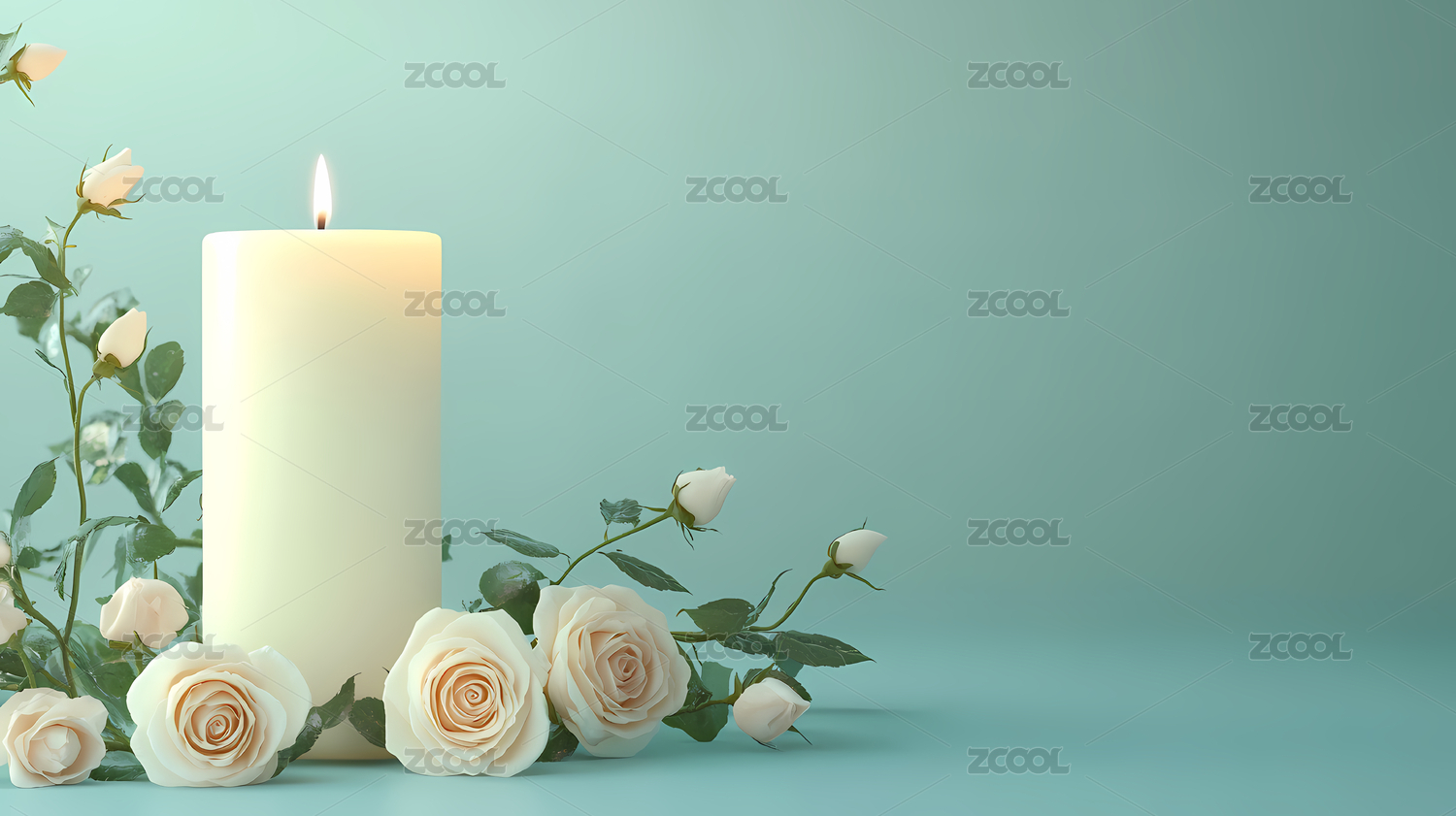 点燃白蜡烛红玫瑰环绕