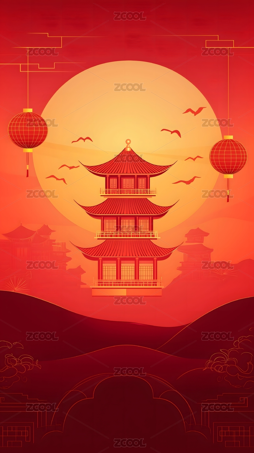 红色圆月旁有梅花饰与传统楼阁在米白背景呈