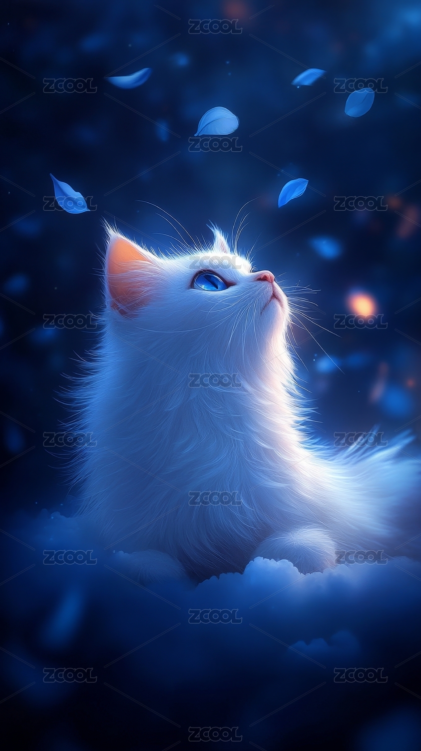 猫咪仰望蓝色花瓣