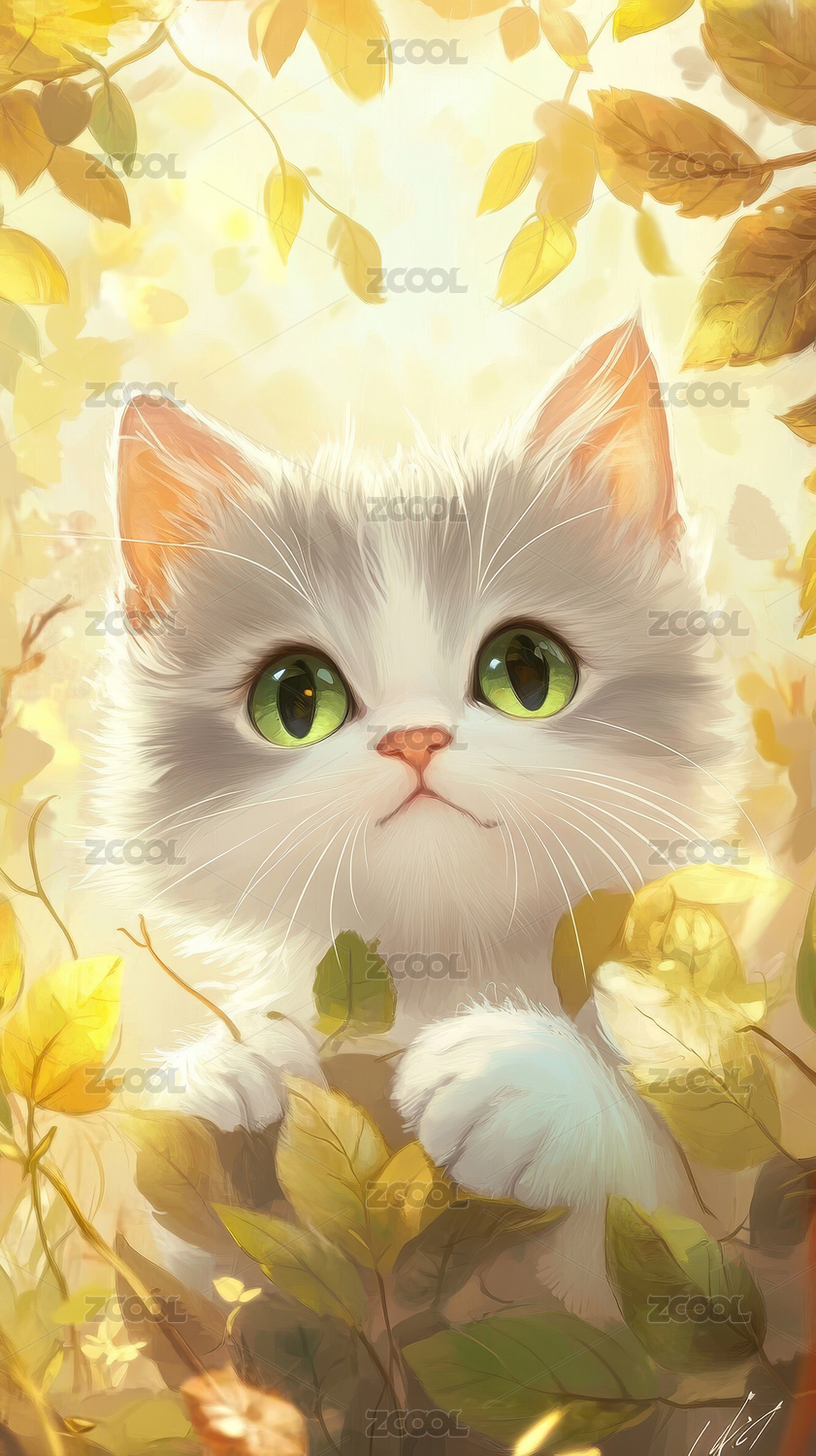 草丛中的白猫插画壁纸