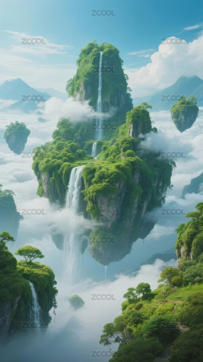 自然,景色,天空,仙境,云端,孤峰,翠树,山峰,奇峰,云海