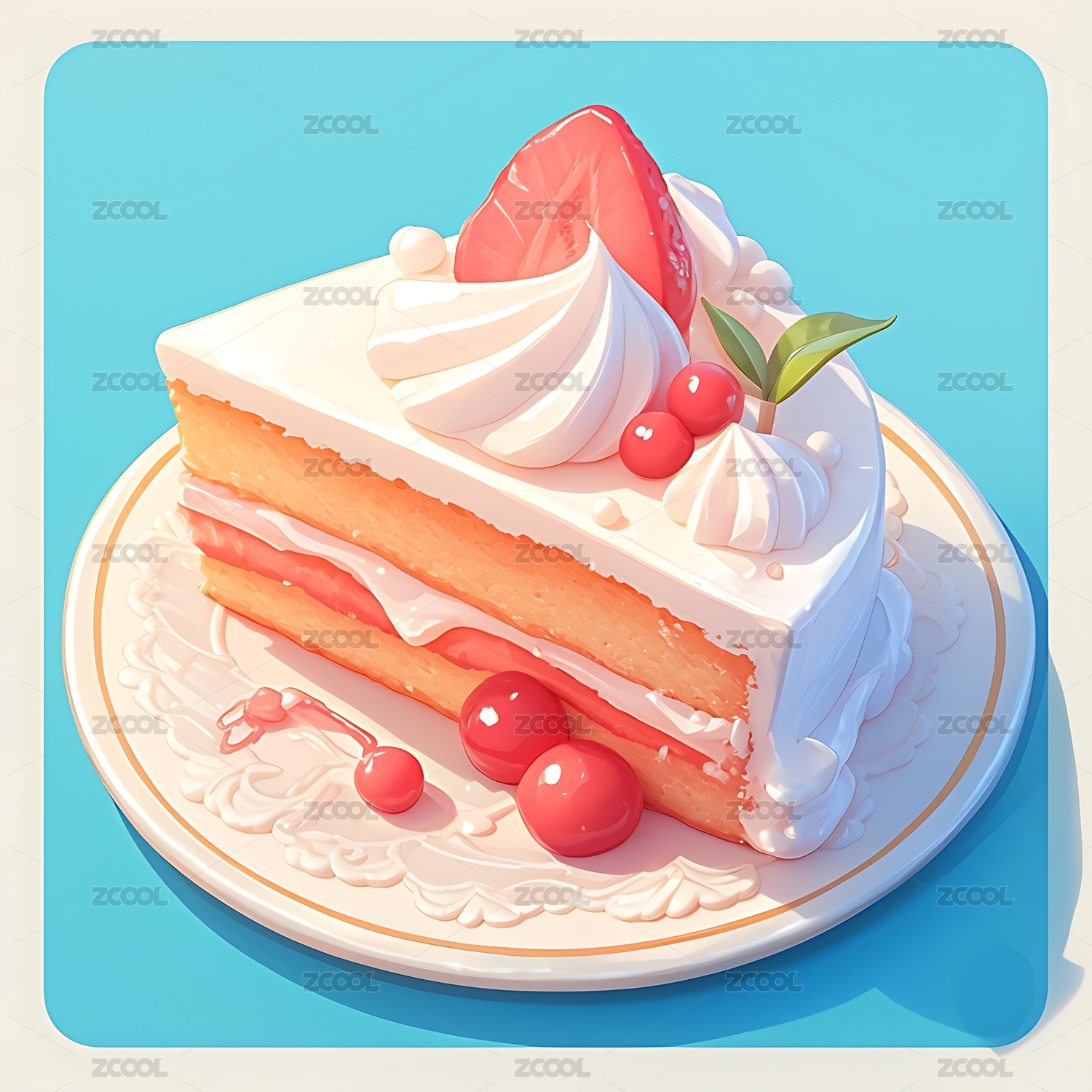 盘子上切开的水果奶油蛋糕3D卡通食品插画
