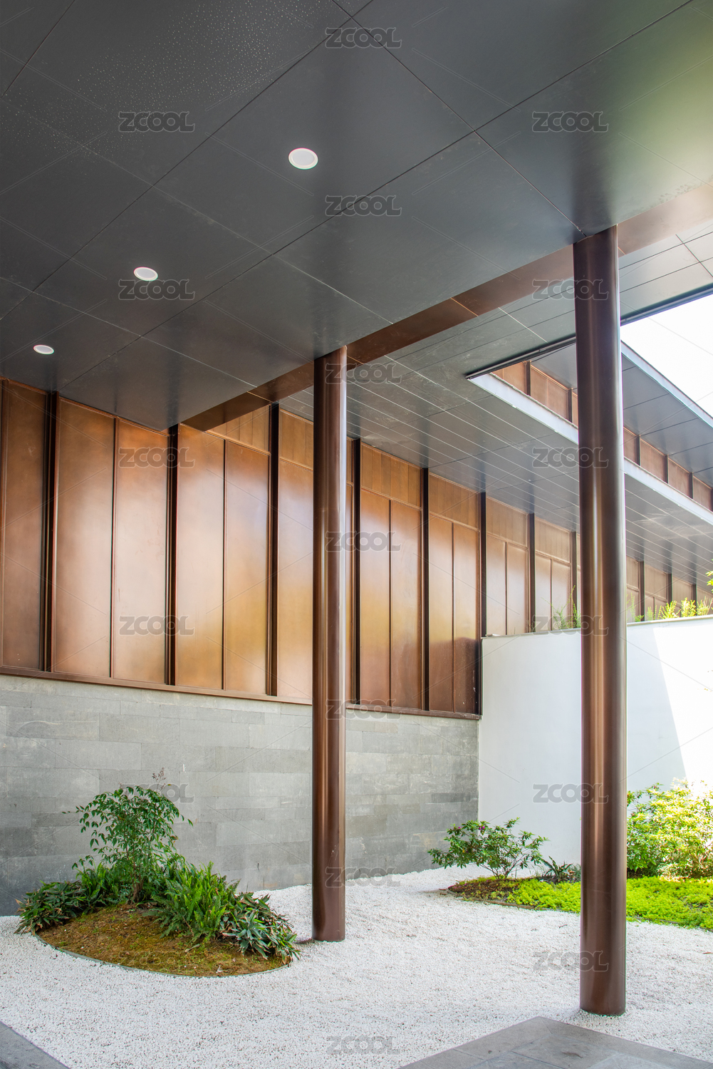 明亮走廊绿植环绕现代建筑设计