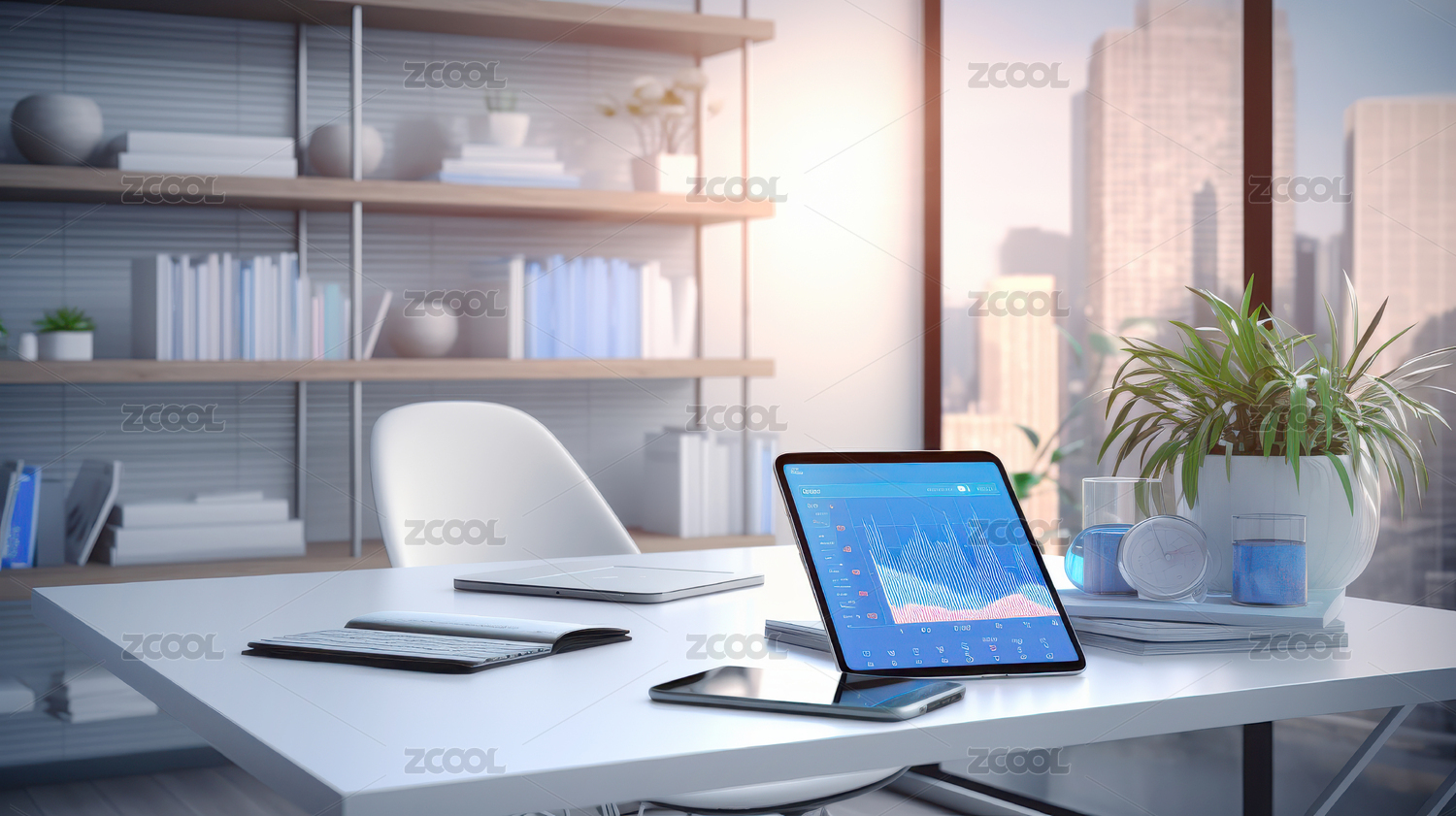 办公桌,电脑,平板,手机,键盘,鼠标,植物,灯,咖啡杯