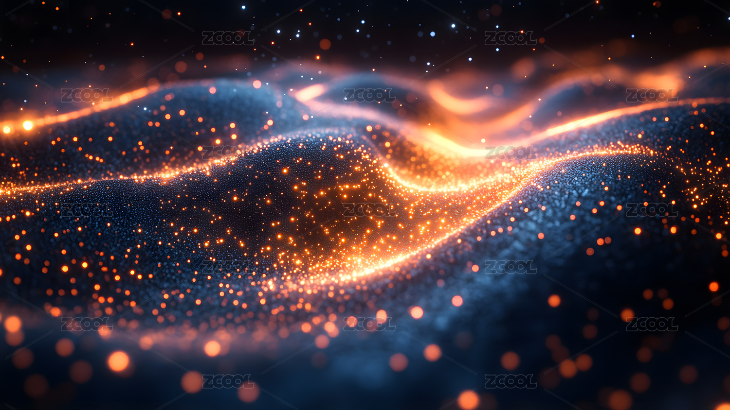 深蓝色波浪抽象海报背景,散发着橙色光点