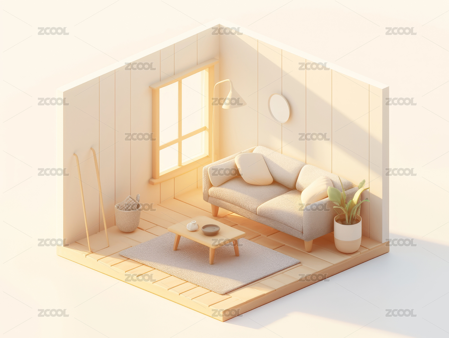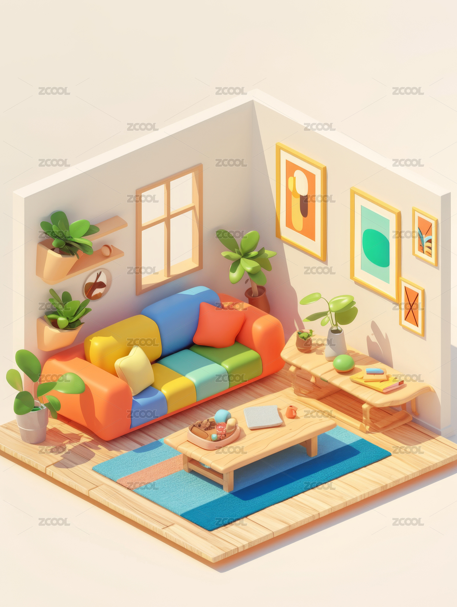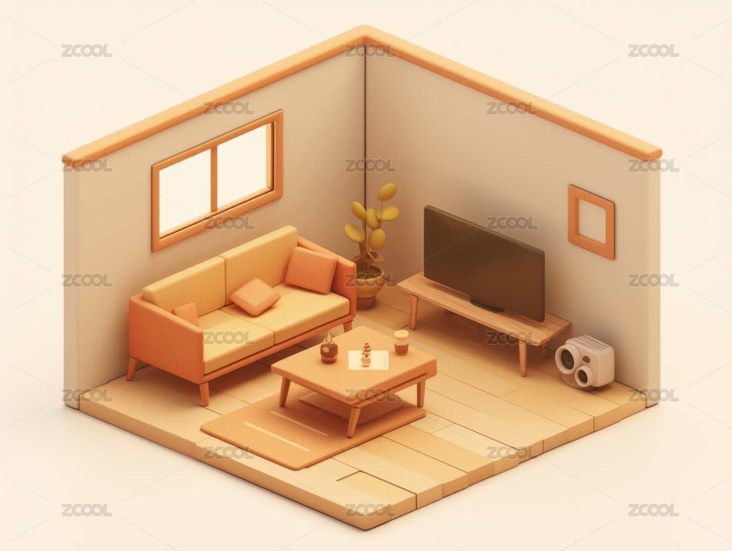 暖色客厅装修俯视立体轴测图3D卡通插画