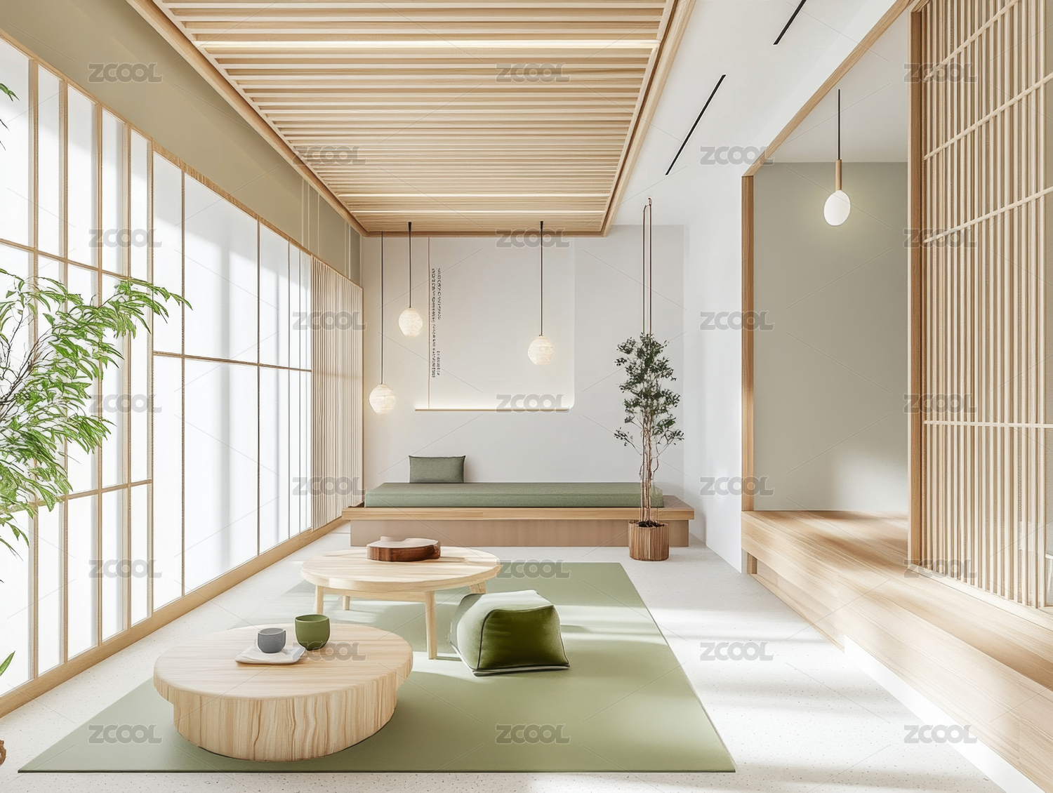 日式,茶室,简约,榻榻米,木质,吊灯,茶具,窗户,装饰,自然