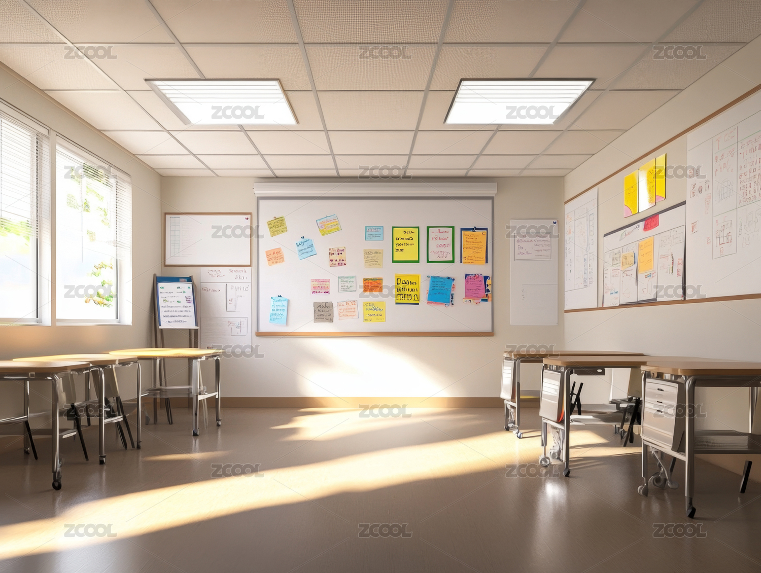 教室,课桌,椅子,白板,投影仪,窗户,海报,教育,室内,照明