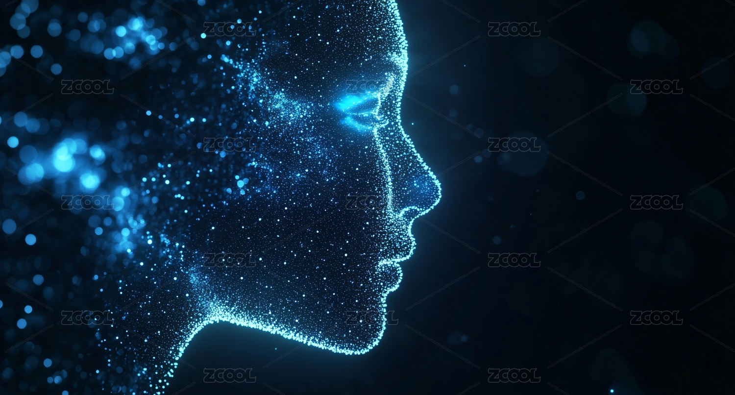 蓝色发光粒子生成人脸抽象虚拟人工智能插画