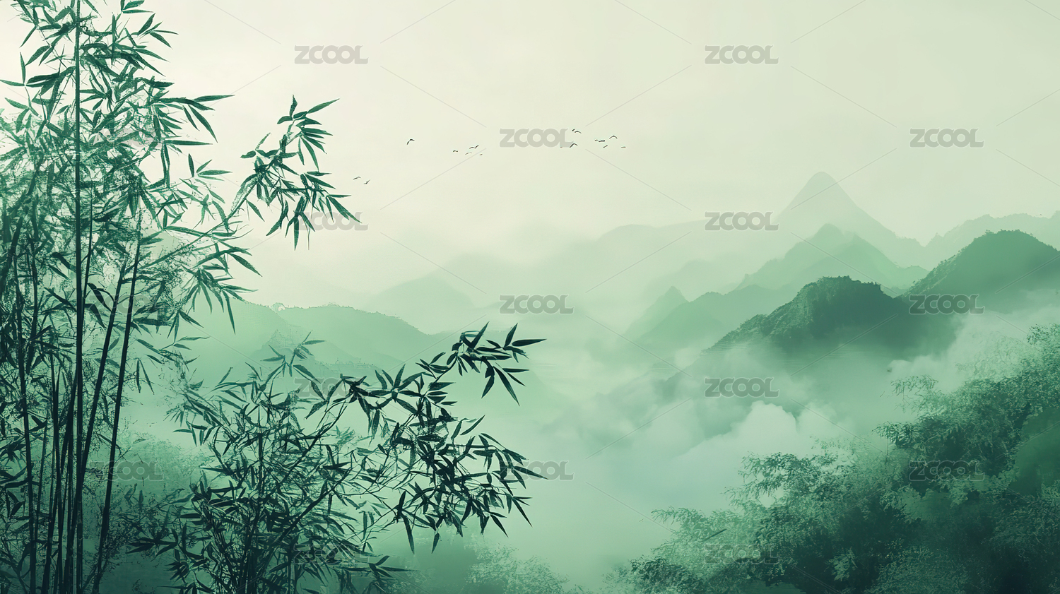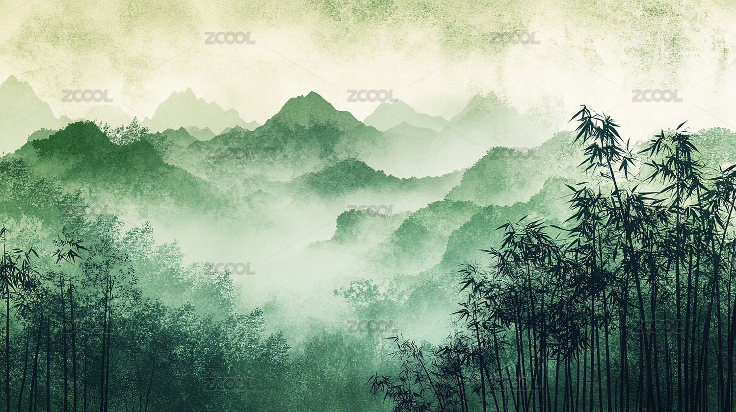 水墨竹林山峦景色