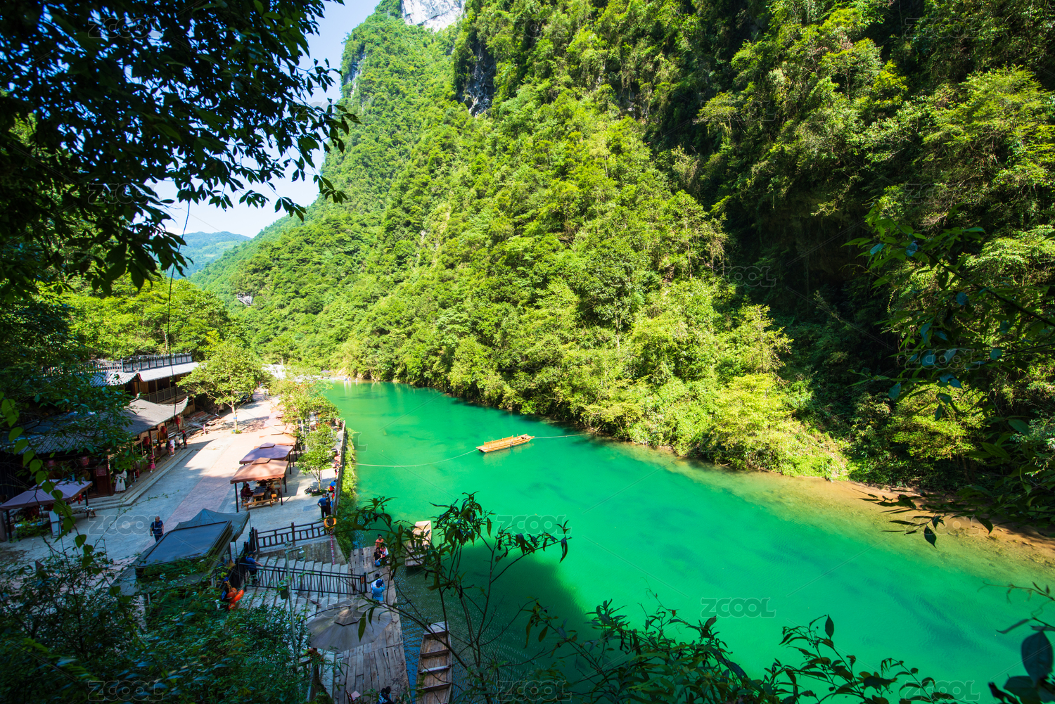 张家界大峡谷底部溪流的运客船