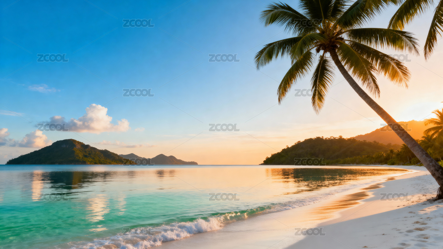 海滩, 棕榈树, 山脉, 海水, 天空。