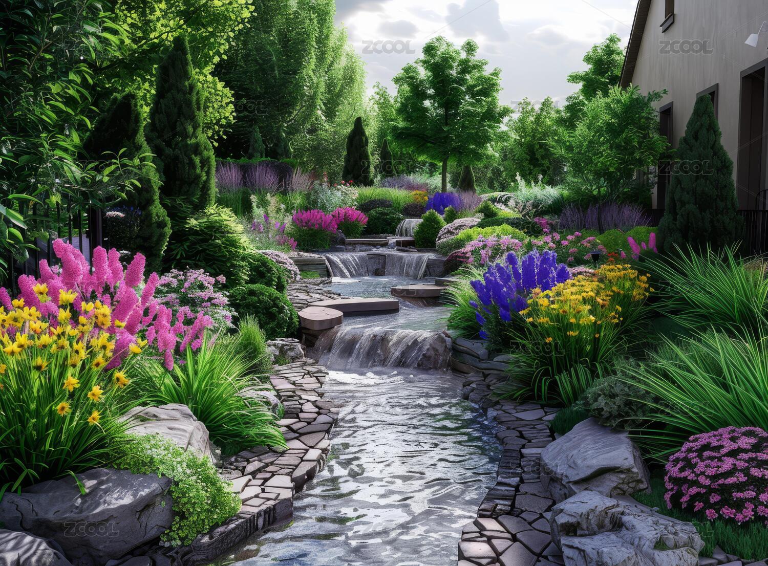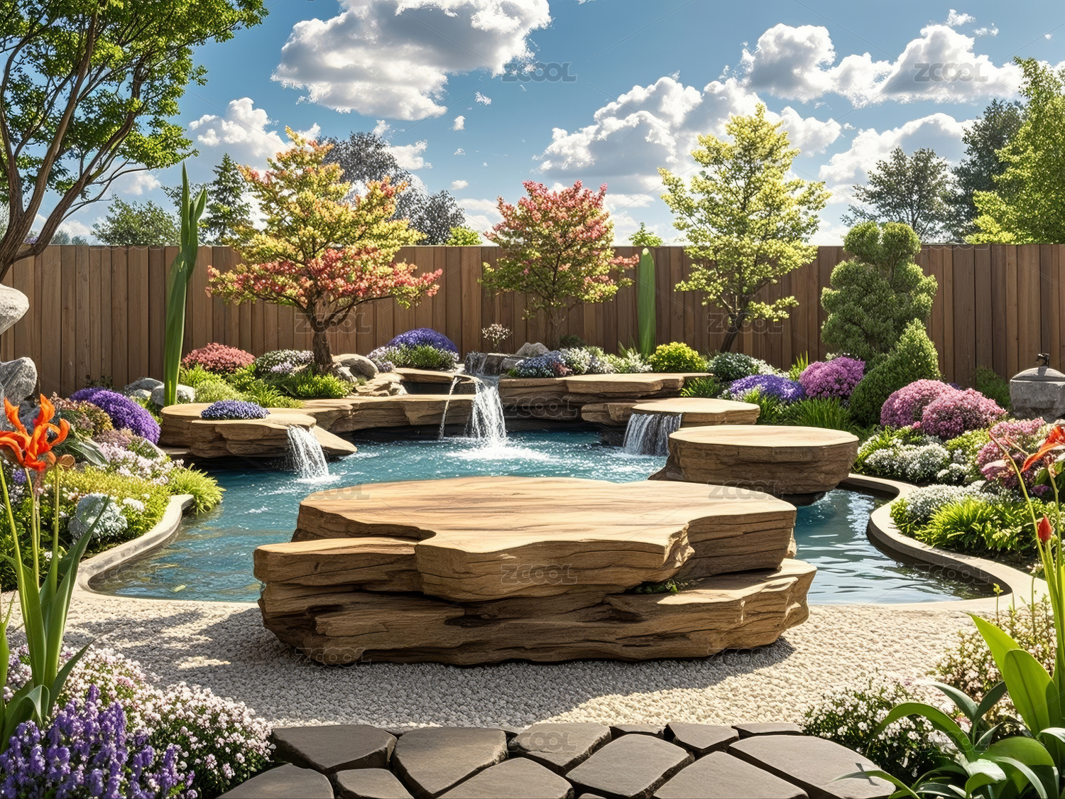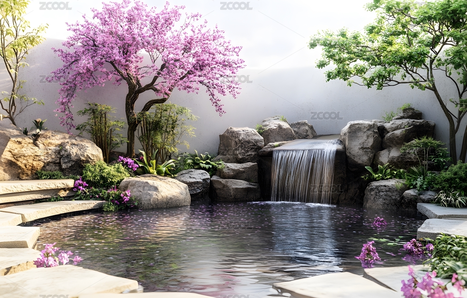 微型景观,紫色花树,小瀑布,石块,苔藓