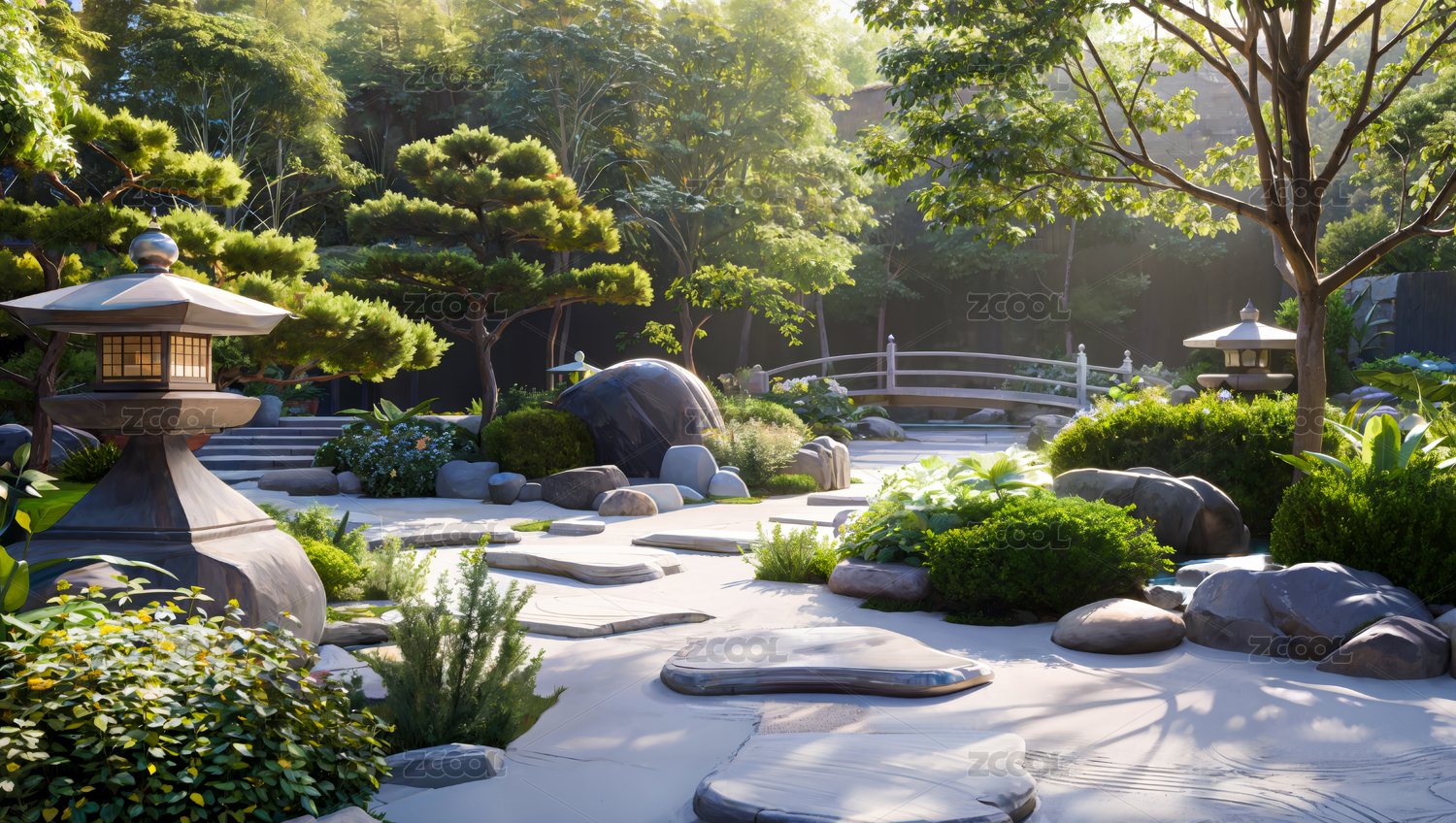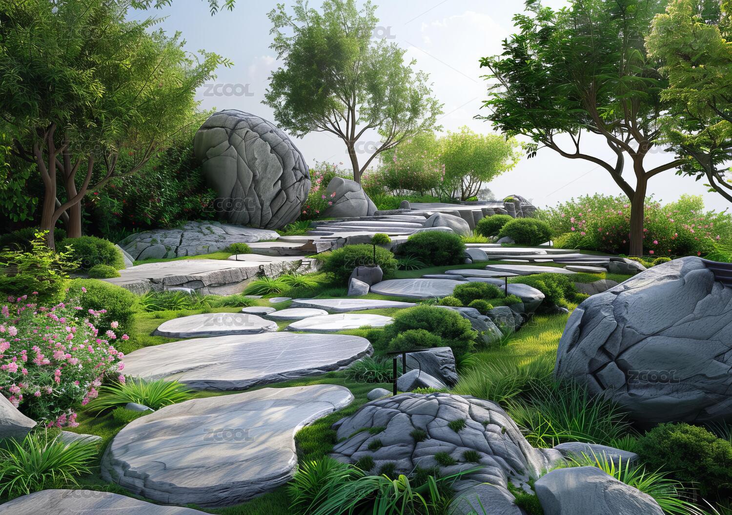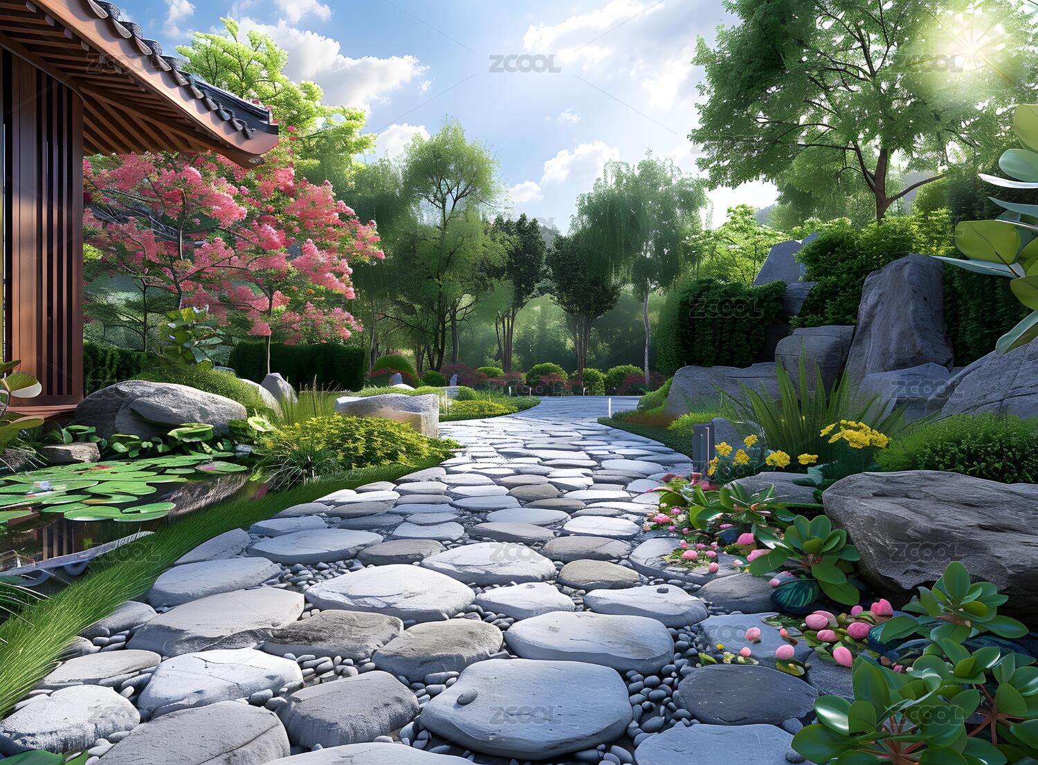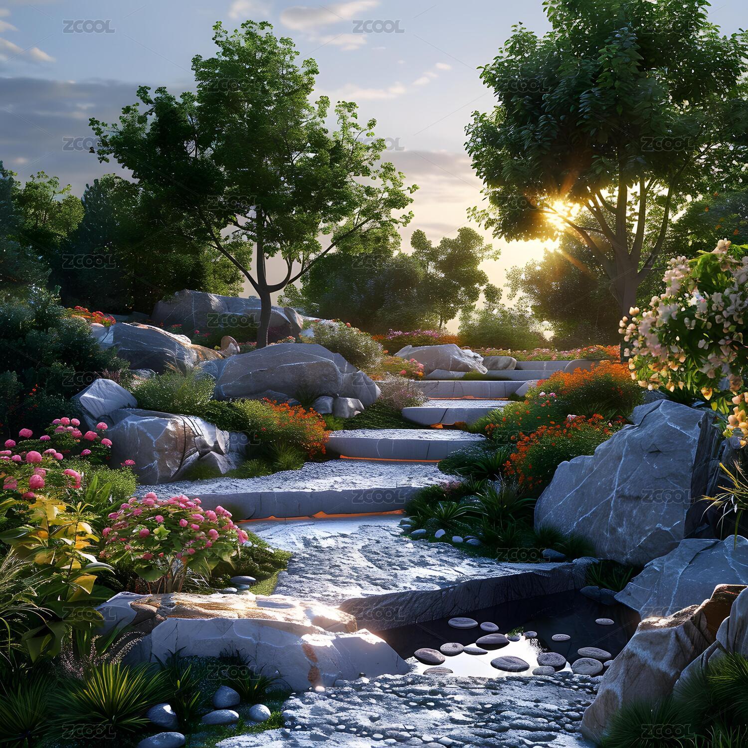 微型景观,紫色花树,小瀑布,石块,苔藓