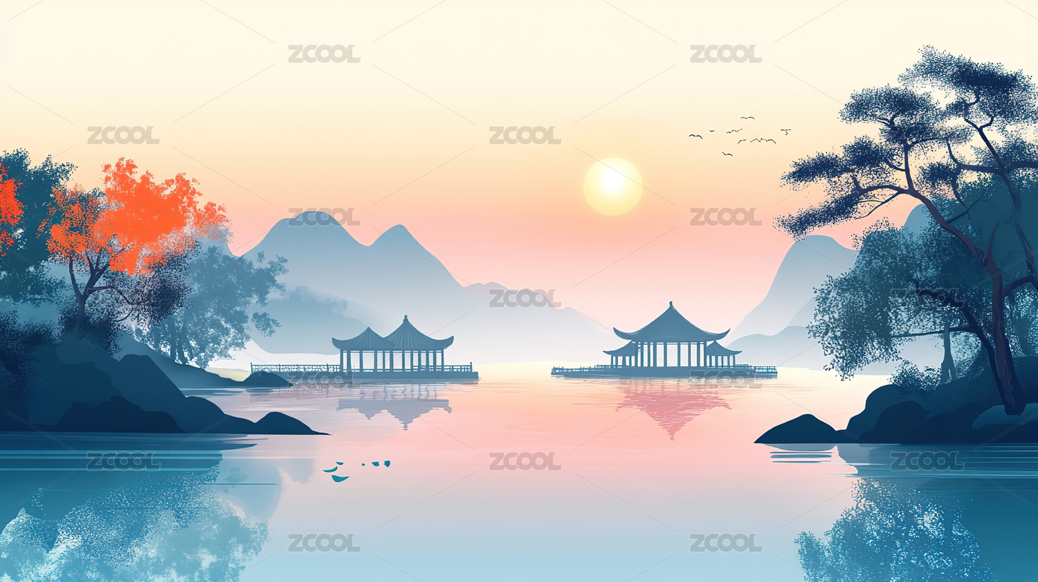 风景,插画,背景,壁纸,高山,河流,水,倒影,反射,天空